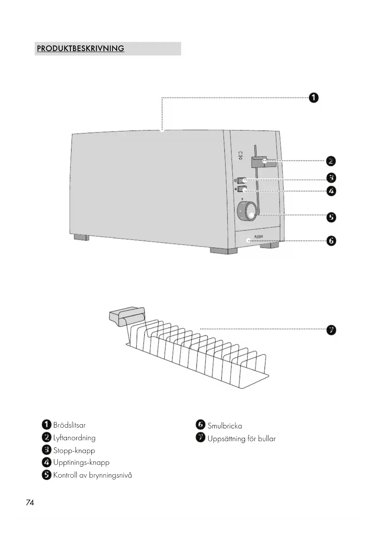 När du använder apparaten för första gången ska du använda den 1-2 gånger på högsta inställningen utan att rosta något, eftersom det kan uppstå en lätt lukt på grund av eventuella dammrester på värmestavarna. ROSTA Anslut apparaten till elnätet: ● Placera maten som ska stekas i slitsarna. ● Välj önskad brynningsgrad. Nivå 1 (ljus) - Nivå 6 (mycket mörk) . ● Tryck ner lyftknappen tills den låses på plats. LYFTANORDNING Lyftanordningen gör det lättare för dig att ta ut den rostade maten. Tryck lyftknappen uppåt och ta ut den rostade maten.81