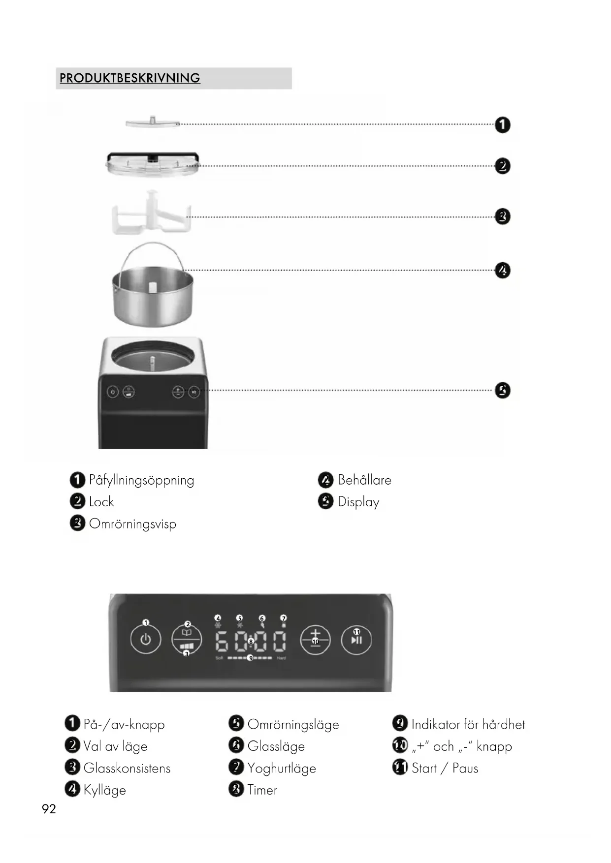● Tryck på “+” och “-” för att ställa in önskad tid. Maximalt 90 minuter. ● När du har valt önskad tid, tryck på knappen . Timern börjar med den inställda tiden och tar slut. ● Under beredningsprocessen kan du fylla på olika ingredienser genom fyllnings- öppningen i locket. VIKTIGT! Om glassen blir för fast innan tiden har gått, stoppar enheten omrörningsprocessen automa- tiskt. Glassen kan sedan tas ut. ● När tiden har gått stannar enheten och tre pip hörs. ● Stäng av enheten eller låt glassen kyla ytterligare (se automatiskt kylläge). ● Ta bort locket och behållaren. ● Om behållaren är fastfrusen, vänta en stund och försök igen. ● Fyll om glassen. Använd inga vassa eller spetsiga föremål för borttagning. TILLBERED GLASS MED JUSTERBAR GLASSKONSISTENS (CREAM CONTROL) ● Tryck , sedan kan du använda knapparna “+” och “-” för att ställa in önskad fasthet för glassmassan (3 nivåer).100 VIKTIGT! Råkade du trycka knappen och skulle vilja starta glasstillverkningen via timern, då tryck på nytt knappen . Tiden 60:00 visas. Du kan nu ställa in timern. ● Tryck knappen. ● Drifttiden visas som information från 00:00 tills den inställda hårdhetsgraden har uppnåtts. ● Under beredningsprocessen kan du fylla på olika ingredienser genom fyllnings- öppningen i locket. ● När önskad hårdhetsgrad har uppnåtts stannar enheten och tre pip hörs. ● Stäng av enheten eller låt glassen kyla ytterligare (se automatiskt kylläge). ● Ta bort locket och behållaren. ● Om behållaren är fastfrusen, vänta en stund och försök igen. ● Fyll om glassen. Fyll om glassen. Använd inga vassa eller spetsiga föremål för borttagning.