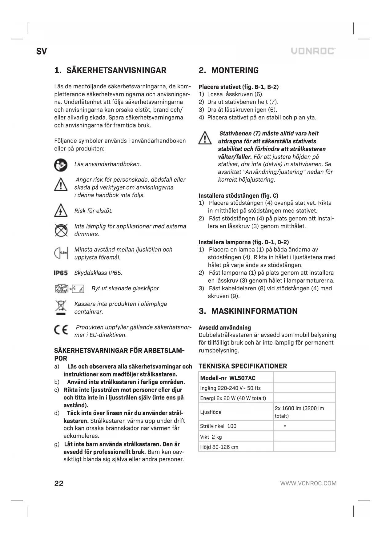 Avsedd användning Dubbelstrålkastaren är avsedd som mobil belysning för tillfälligt bruk och är inte lämplig för permanent rumsbelysning. TEKNISKA SPECIFIKATIONER Modell-nr WL507AC Ingång 220-240 V~ 50 HzEnergi 2x 20 W (40 W totalt)Ljusflöde2x 1600 lm (3200 lm totalt)Strålvinkel 100 Vikt 2 kgHöjd 80-126 cmSV