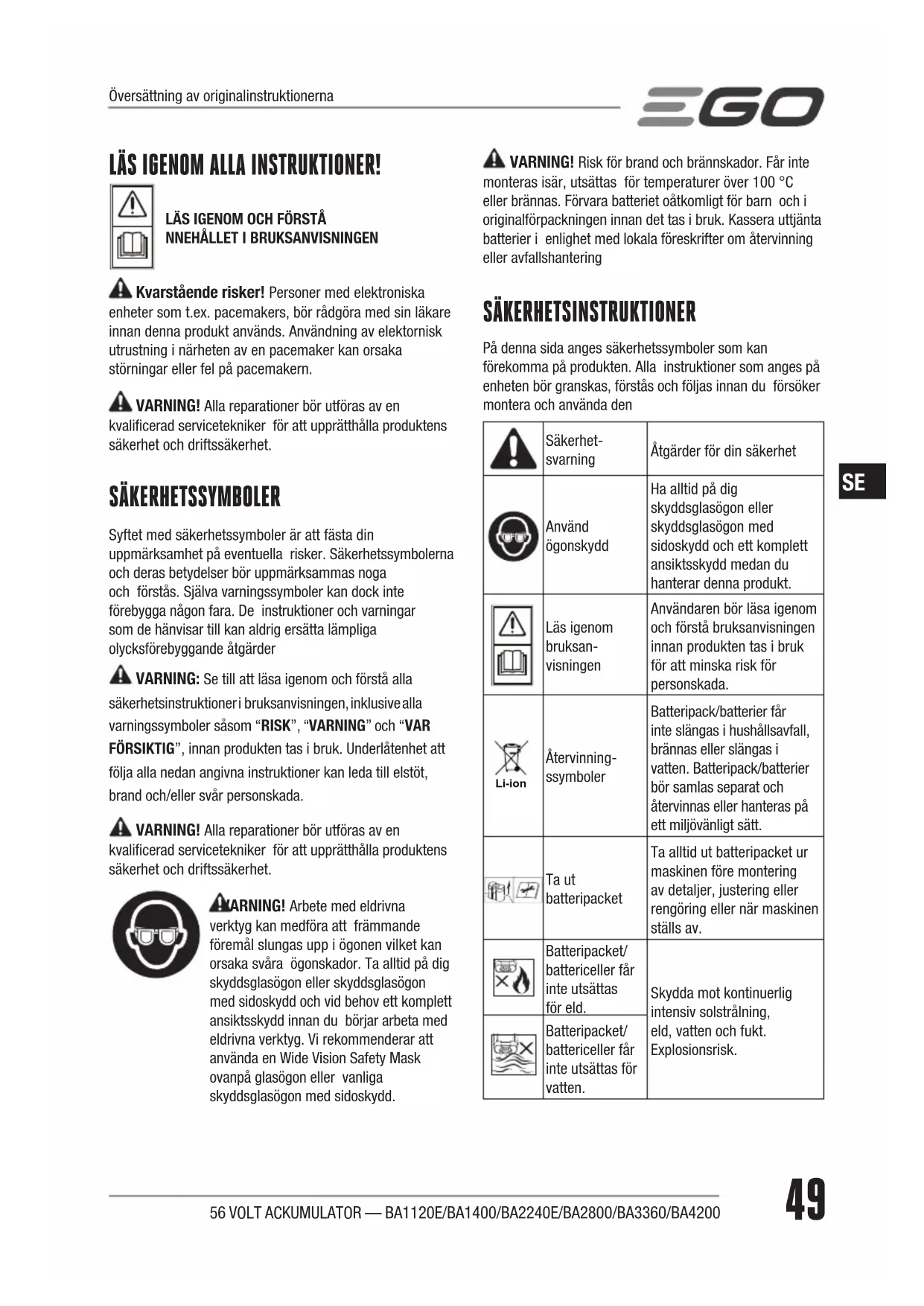 Omgivning- stemperatur vid laddning av batteripacket För bästa resultat bör batteriet laddas i en miljö där temperaturen är över 5°C och under 40°C. V Volt Spänning A Ampere Ström Hz Hertz Frekvens (cykler per sekund) W Watt Effekt min Minuter Tid Växelström Strömtyp Likström Strömmens typ eller egenskap VARNING! Läs igenom och förstå alla instruktioner. Underlåtenhet att följa alla instruktioner kan leda till elstöt, brand och/eller svår personskada. Termen “eldrivna verktyg” i alla angivna varningar hänvisar till batteridrivna (sladdlösa) gräsklippnings- och trädgårdsmaskiner av EGO Power+.