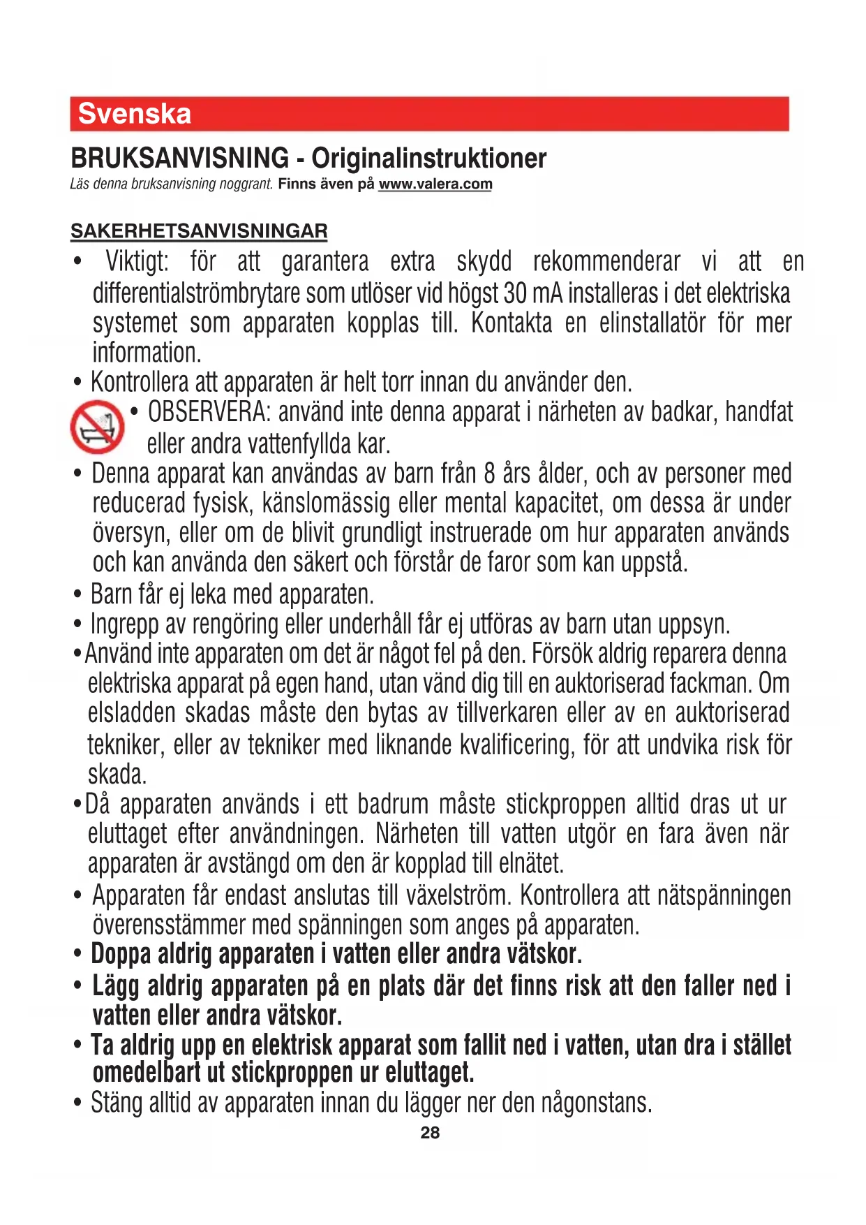 om reparationer görs av icke auktoriserade personer. Om fel uppstår ska apparaten återsändas väl emballerad tillsammans med ett daterat garantibevis som ska vara stämplat av återförsäljaren. Apparaten ska sändas till något av våra auktoriserade Servicecenter eller till återförsäljaren, som i sin tur sedan sörjer för att apparaten skickas vidare till den officiella importören för garantireparation. 00060713_19-03_Layout 1 29/01/2019 11:19 Pagina 3031 Suomi KAYTTOOHJEET - Alkuperäiset ohjeet Lue huolellisesti nämä käyttöohjeet. Saatavana myös osoitteesta www.valera.com TURVALLISUUSOHJEET