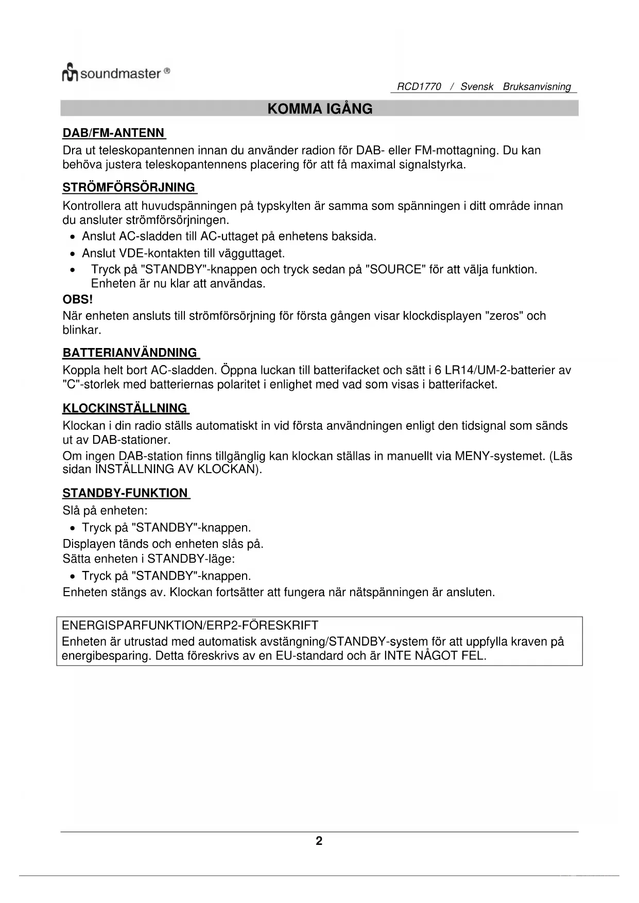 Enheten är utrustad med automatisk avstängning/STANDBY-system för att uppfylla kraven på energibesparing. Detta föreskrivs av en EU-standard och är INTE NÅGOT FEL.RCD1770