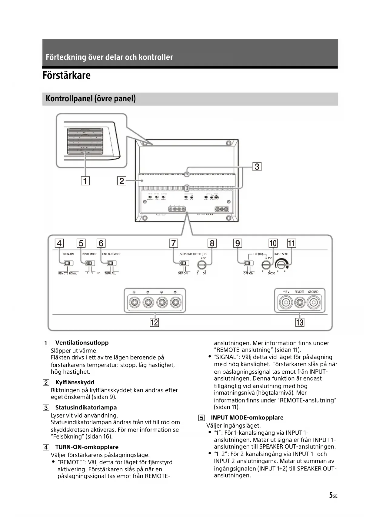 yser vit vid användning. Statusindikatorlampan ändras från vit till röd om sky ddskretsen aktiveras. För mer information se ”Felsökning” (sidan 16). TURN-ON-omkopplare Väljer förstärkarens påslagningsläge. ”REMOTE”: Välj detta för läget för fjärrstyrd aktiv ering. Förstärkaren slås på när en påslagningssignal tas emot från REMOTE- ans lutningen. Mer information finns under ”REMOTE-anslutning” (sidan 11). ”SIGNAL”: Välj detta vid läget för påslagning