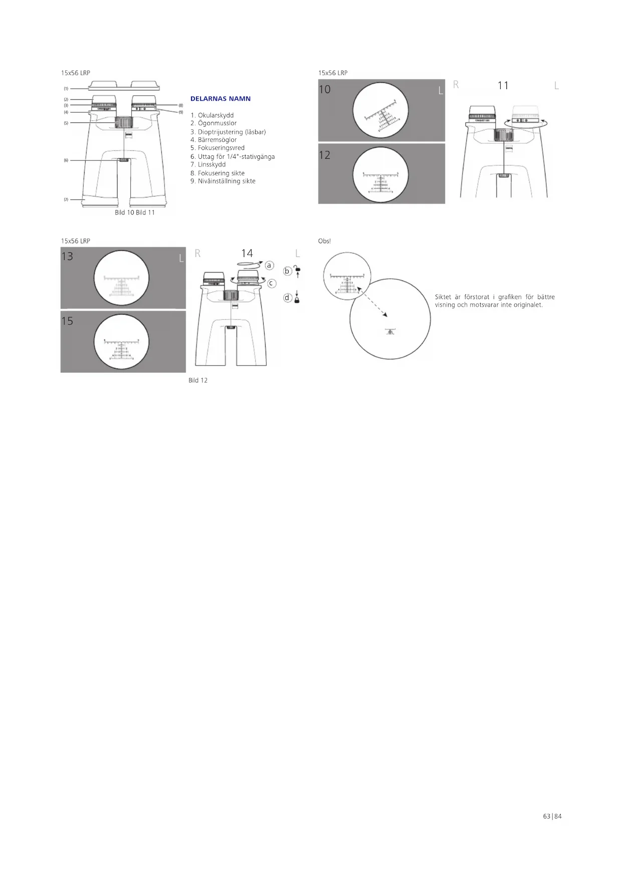 15x56 LRP Bild 10 Bild 11 Bild 12 Siktet är förstorat i graken för bättre visning och motsvarar inte originalet. Obs!64 | 84 BRUKSANVISNING Grattis till köpet av din nya kikare ZEISS CONQUEST HDX