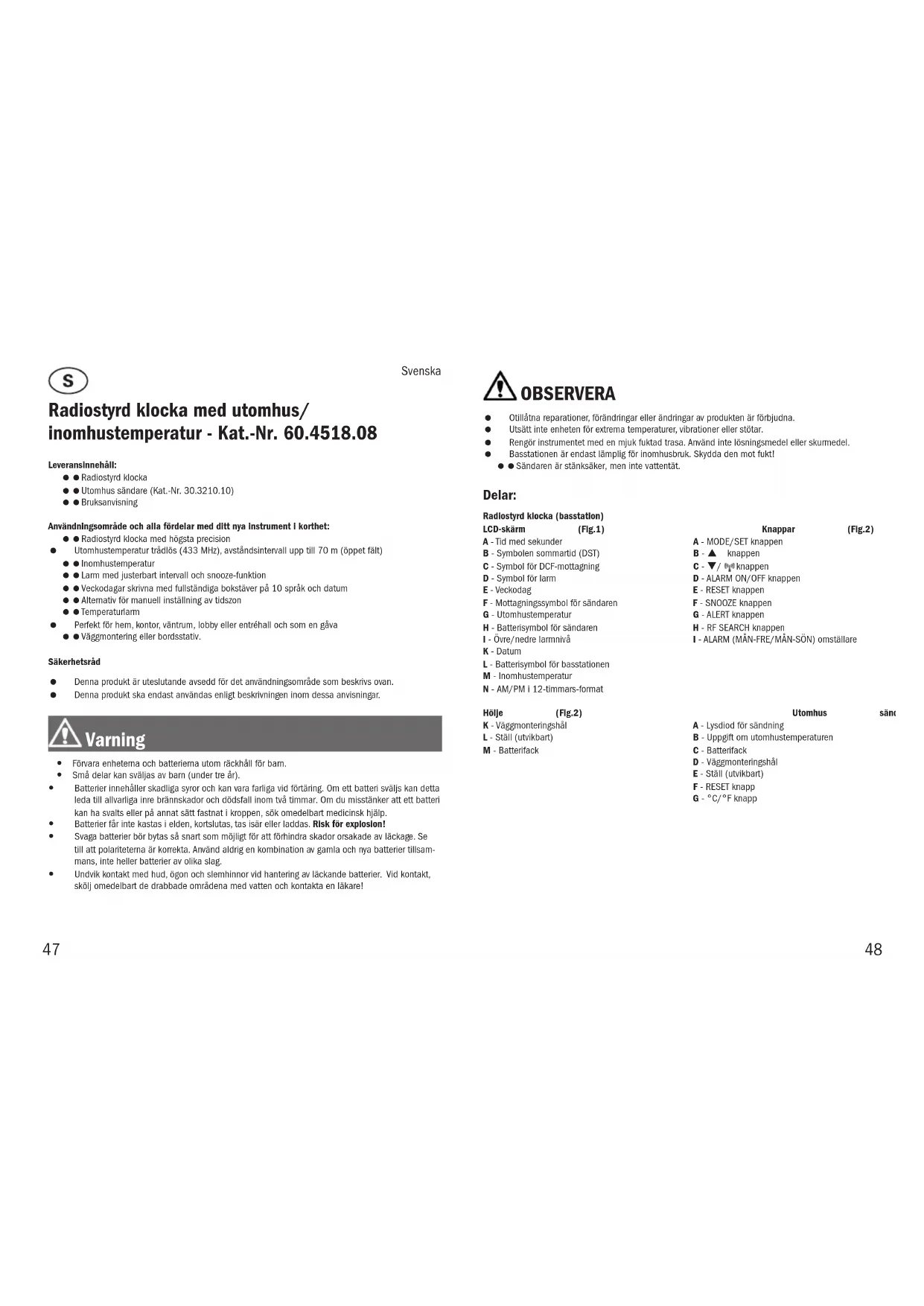 Problema Solución Ninguna indicación de estación base o emisor exterior Asegúrese que las pilas estén colocadas con la polaridad correcta Cambiar las pilas Ninguna recepción DCF Comenzar la inicialización manualmente Intentar la recepción de noche Elegir otro lugar para el dispositivo Ajustar la hora manualmente Ninguna recepción del emisor, indicación „- - . -“ Ningún emisor exterior instalado Comprobar las pilas del emisor exterior (¡No utilizar baterías!) Comenzar una búsqueda manual del emisor Elegir otro lugar para el emisor y/o la estación base/reducir la distancia Indicación incorrecta en la estación base o emisor exterior Cambiar las pilas Estación base: Pulse el botón RESET con un objeto puntiagudo Emisor exterior: Pulse la tecla RESET Si a pesar de haber seguido estos pasos, el dispositivo no funciona, diríjase al establecimiento donde adquirió el producto.Estas instrucciones o extractos de las mismas no pueden ser publicados sin la autorización de la TFA Dostmann. Los datos técnicos de este producto corresponden al estado en el momento de la impresión y pueden ser modicados sin previo aviso. Los actuales datos técnicos e informaciones sobre su producto los puede encontrar bajo el número de artículo en nuestra página web. Declaración UE de conformidad Por la presente, TFA Dostmann declara que el tipo de equipo radioeléctrico 60.4518 es conforme con la Directiva 2014/53/UE. El texto completo de la declaración UE de conformidad está disponible en la dirección Internet siguiente: www.tfa-dostmann.de/service/downloads/ce www.tfa-dostmann.de E-Mail: info@tfa-dostmann.de 06/2023 TFA Dostmann GmbH & Co. KG | Zum Ottersberg 12 | D-97877 Wertheim | Alemania Eliminación Este producto y su embalaje han sido fabricados con materiales y componentes de alta calidad que pueden ser reciclados y reutilizados. Así se reducen los residuos y se protege el medio ambiente. Eliminar el embalaje de una forma respetuosa con el medio ambiente a través de los sistemas de recogida establecidos. Eliminación de los dispositivos eléctricos Retire las pilas y baterías recargables que no están instaladas de forma permanente y deséchelas por separado del producto. Este dispositivo está identicado conforme a la Directiva de la UE sobre residuos de aparatos eléctricos y electrónicos (WEEE). No deseche este producto junto con la basura doméstica. El usuario está obligado a llevar el dispositivo usado a un punto de recogida de aparatos eléctricos y electrónicos acreditado para que sea eliminado de manera respetuosa con el medio ambiente. La devolución es gratuita. Tenga en cuenta las normas vigentes actuales. Eliminación de las pilas Las pilas y baterías no pueden desecharse en ningún caso junto con la basura doméstica. Contienen contaminantes que pueden perjudicar el medio ambiente y la salud si se eliminan de forma inadecuada. Como consumidor, está obligado legalmente a depositar las pilas y baterías usadas de manera respetuosa con el medio ambiente en el comercio especializado o bien en los centros de recogida y reciclaje previstos para ello según el reglamento nacional o local. La devolución es gratuita. Las denominaciones de los metales pesados que contienen son: Cd=cadmio, Hg=mercurio, Pb=plomo. Datos técnicos Estación base Alimentación de tensión: Pilas 4 x 1,5 V AA (no incluidas) Gama de medición - temperatura: -10°C … 50°C / 14°F… 122°F Indicación LL.L /HH.H: Temperatura está fuera del rango de medición Dimensiones de cuerpo: 248 x 25 (73) x 206 mm Peso: 481 g (solo dispositivo) Emisor exterior Alimentación de tensión: Pilas 2 x 1,5 V AAA (no incluidas) Gama de medición - temperatura: -20°C … 50°C / -4 °F… 122 °F Alcance: Máximo de 70 m (campo libre) Frecuencia de transmisión: 433 Mhz Potencia máxima de radiofrecuencia transmitida: < 10 mW Dimensiones de cuerpo: 62 x 24 (35) x 102 mm Peso: 63 g (solo dispositivo) 45 46Svenska Radiostyrd klocka med utomhus/ inomhustemperatur - Kat.-Nr. 60.4518.08 Leveransinnehåll: Radiostyrd klocka Utomhus sändare (Kat.-Nr. 30.3210.10) BruksanvisningAnvändningsområde och alla fördelar med ditt nya instrument i korthet: Radiostyrd klocka med högsta precision Utomhustemperatur trådlös (433 MHz), avståndsintervall upp till 70 m (öppet fält) Inomhustemperatur Larm med justerbart intervall och snooze-funktion Veckodagar skrivna med fullständiga bokstäver på 10 språk och datum Alternativ för manuell inställning av tidszon Temperaturlarm Perfekt för hem, kontor, väntrum, lobby eller entréhall och som en gåva Väggmontering eller bordsstativ.Säkerhetsråd Denna produkt är uteslutande avsedd för det användningsområde som beskrivs ovan. Denna produkt ska endast användas enligt beskrivningen inom dessa anvisningar. Varning y Förvara enheterna och batterierna utom räckhåll för barn. y Små delar kan sväljas av barn (under tre år). y Batterier innehåller skadliga syror och kan vara farliga vid förtäring. Om ett batteri sväljs kan detta leda till allvarliga inre brännskador och dödsfall inom två timmar. Om du misstänker att ett batteri kan ha svalts eller på annat sätt fastnat i kroppen, sök omedelbart medicinsk hjälp. y Batterier får inte kastas i elden, kortslutas, tas isär eller laddas. Risk för explosion! y Svaga batterier bör bytas så snart som möjligt för att förhindra skador orsakade av läckage. Se till att polariteterna är korrekta. Använd aldrig en kombination av gamla och nya batterier tillsam- mans, inte heller batterier av olika slag. y Undvik kontakt med hud, ögon och slemhinnor vid hantering av läckande batterier. Vid kontakt, skölj omedelbart de drabbade områdena med vatten och kontakta en läkare! OBSERVERA Otillåtna reparationer, förändringar eller ändringar av produkten är förbjudna. Utsätt inte enheten för extrema temperaturer, vibrationer eller stötar. Rengör instrumentet med en mjuk fuktad trasa. Använd inte