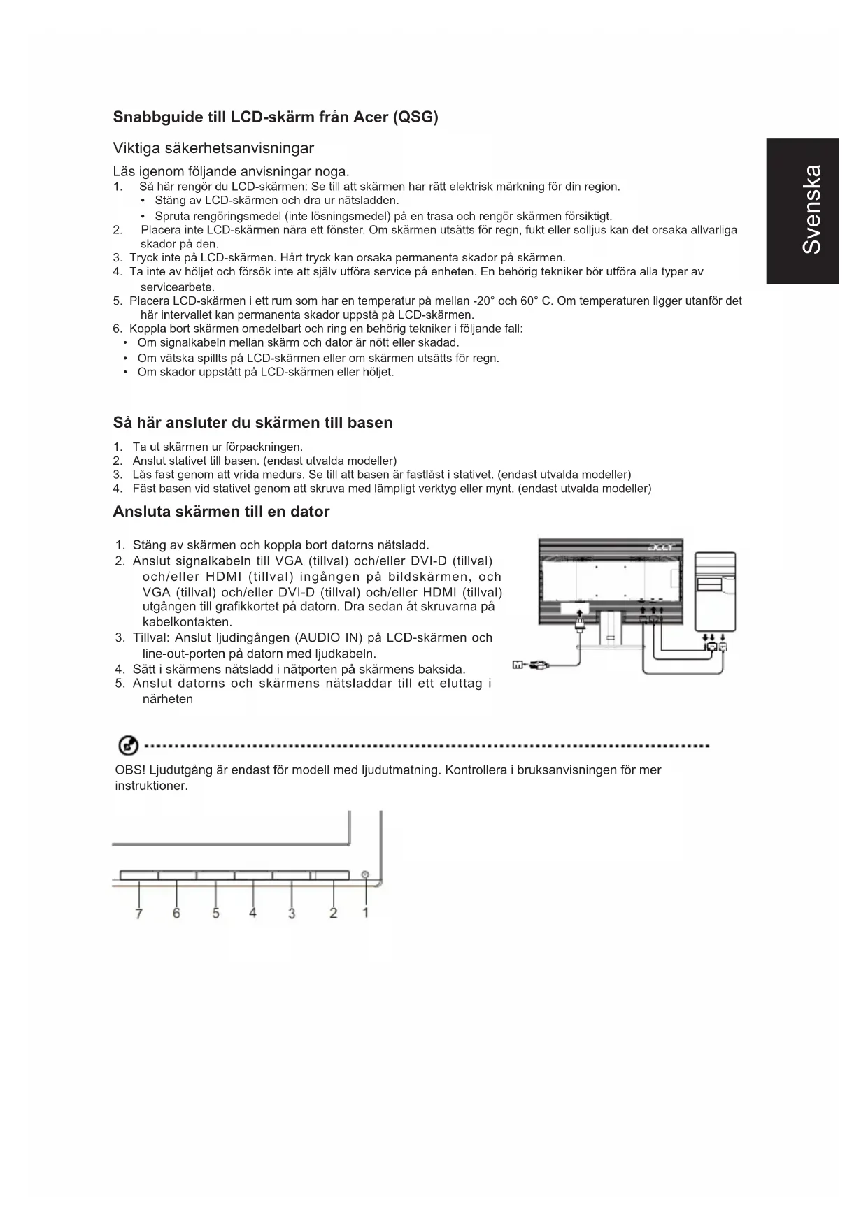 Fokus Klocka Språk OSD Timeout Wide Mode DDC / CI ACM Ingång Autokälla Quick Start Mode Återställa Information *Allaspecikationerkanändrasutanföregåendemeddelande. PåAcersofciellasupportwebbplatshittarduhandböckerochandradokumentfördinAcer-produkt. *Den årliga energiförbrukningen beräknas utifrån en typisk strömförbrukning i 4 timmar per dag, 365 dagar per år.繁體中文 Acer LCD 顯示器快速使用指南(QSG)