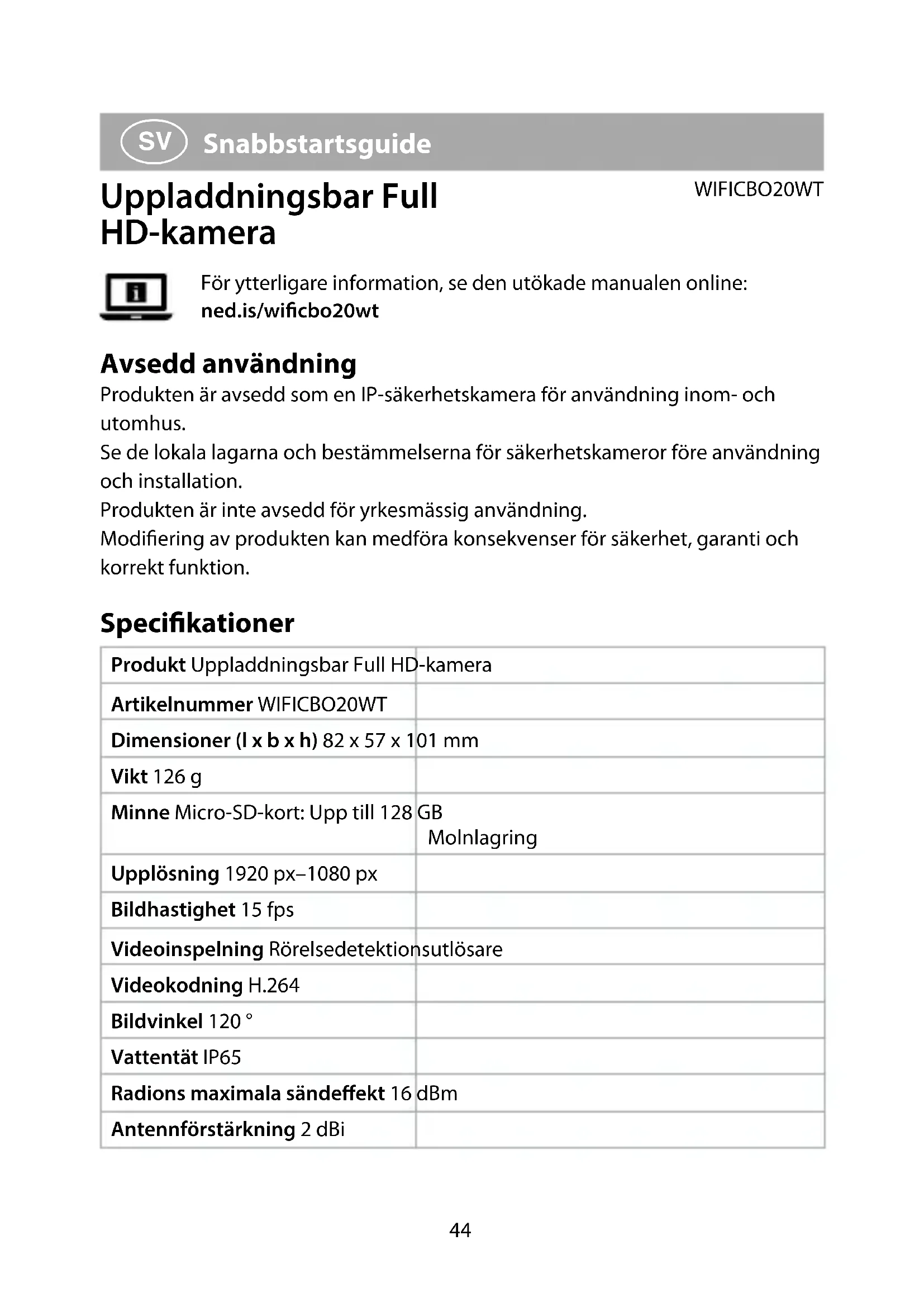 Snabbstartsguide Uppladdningsbar Full HD-kamera WIFICBO20WT För ytterligare information, se den utökade manualen online: ned.is/wicbo20wt Avsedd användning Produkten är avsedd som en IP-säkerhetskamera för användning inom- och utomhus. Se de lokala lagarna och bestämmelserna för säkerhetskameror före användning och installation. Produkten är inte avsedd för yrkesmässig användning. Modiering av produkten kan medföra konsekvenser för säkerhet, garanti och korrekt funktion. Specikationer Produkt Uppladdningsbar Full HD-kamera Artikelnummer WIFICBO20WT Dimensioner (l x b x h) 82 x 57 x 101 mm Vikt 126 g Minne Micro-SD-kort: Upp till 128 GB Molnlagring Upplösning 1920 px–1080 px Bildhastighet 15 fps Videoinspelning Rörelsedetektionsutlösare Videokodning H.264 Bildvinkel 120 ° Vattentät IP65 Radions maximala sändeekt 16 dBm Antennförstärkning 2 dBi45 Trådlösa anslutningar Wi-Fi: 802.11 b/g/n 2,4 GHz Wi-Fi frekvensområde 2412 - 2472 MHz Lagringstemperatur -20 - 60 °C Arbetstemperatur -20 - 55 °C Kraftingång 5 VDC Mörkerseendeområde 6 - 8 m Bildsensor 2 MP 1/2.9” CMOS-sensor Inbyggd mikrofon - 38 dB Inbyggd högtalare 8 Ω 1 W Batterityp 2 x 18650 (litiumjon) Huvuddelar (bild A) 1 Monteringsvinkel 2 Låsbrytare 3 Kameraobjektiv 4 Mikrofon 5 Ljussensor 6 LED-statusindikator 7 PIR-sensor 8 Micro USB-port 9 Högtalare q Fack för micro SD-kort w Återställningsknapp e Kraftknapp r Batterifack t Micro-USB-kabel Säkerhetsanvisningar
