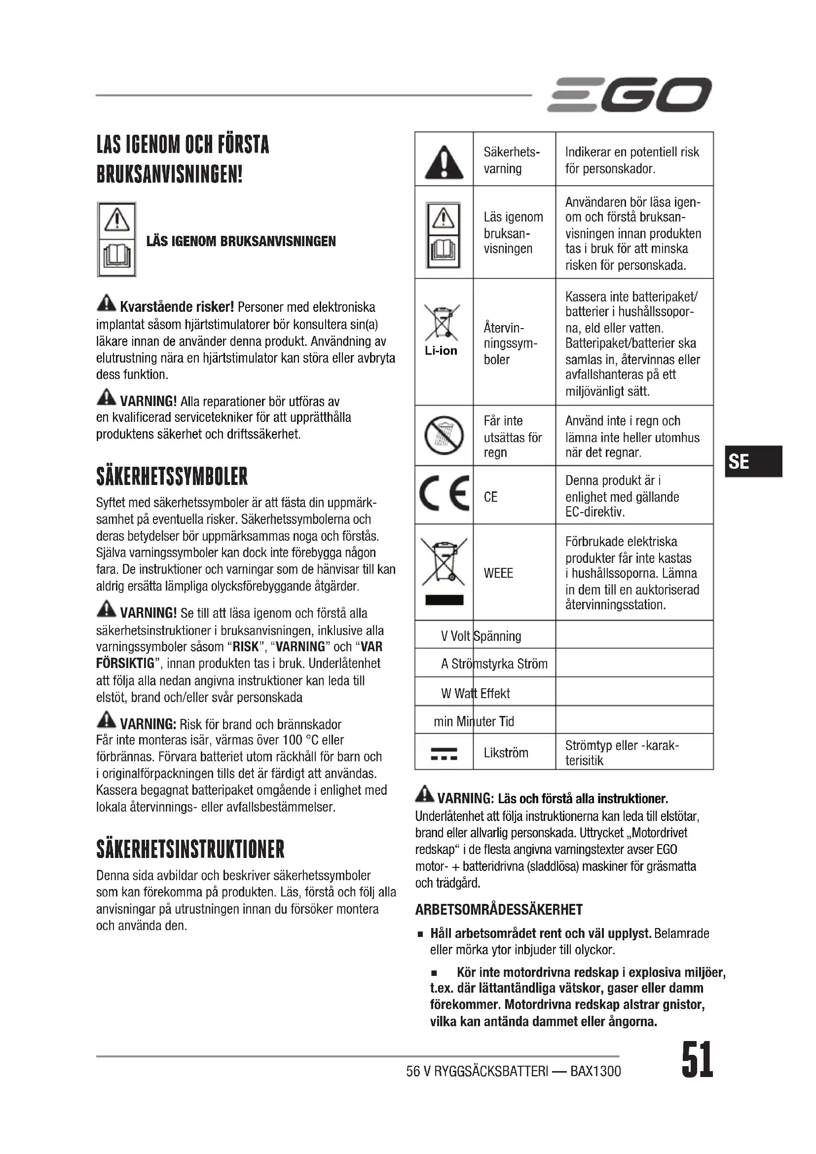 Kvarstående risker! Personer med elektroniska implantat såsom hjärtstimulatorer bör konsultera sin(a) läkare innan de använder denna produkt. Användning av elutrustning nära en hjärtstimulator kan störa eller avbryta dess funktion. VARNING! Alla reparationer bör utföras av en kvalicerad servicetekniker för att upprätthålla produktens säkerhet och driftssäkerhet. SÄKERHETSSYMBOLER Syftet med säkerhetssymboler är att fästa din uppmärk-samhet på eventuella risker. Säkerhetssymbolerna och deras betydelser bör uppmärksammas noga och förstås. Själva varningssymboler kan dock inte förebygga någon fara. De instruktioner och varningar som de hänvisar till kan aldrig ersätta lämpliga olycksförebyggande åtgärder. VARNING! Se till att läsa igenom och förstå alla säkerhetsinstruktioner i bruksanvisningen, inklusive alla varningssymboler såsom “RISK”, “VARNING” och “VAR FÖRSIKTIG”, innan produkten tas i bruk. Underlåtenhet att följa alla nedan angivna instruktioner kan leda till elstöt, brand och/eller svår personskada VARNING: Risk för brand och brännskador Får inte monteras isär, värmas över 100 °C eller förbrännas. Förvara batteriet utom räckhåll för barn och i originalförpackningen tills det är färdigt att användas. Kassera begagnat batteripaket omgående i enlighet med lokala återvinnings- eller avfallsbestämmelser. SÄKERHETSINSTRUKTIONER Denna sida avbildar och beskriver säkerhetssymboler som kan förekomma på produkten. Läs, förstå och följ alla anvisningar på utrustningen innan du försöker montera och använda den.Säkerhets-varningIndikerar en potentiell risk för personskador.Läs igenom bruksan-visningenAnvändaren bör läsa igen-om och förstå bruksan-visningen innan produkten tas i bruk för att minska risken för personskada. Li-ion Återvin-ningssym-bolerKassera inte batteripaket/batterier i hushållssopor-na, eld eller vatten. Batteripaket/batterier ska samlas in, återvinnas eller avfallshanteras på ett miljövänligt sätt.Får inte utsättas för regn Använd inte i regn och lämna inte heller utomhus när det regnar. Denna produkt är i enlighet med gällande EC-direktiv. WEEE Förbrukade elektriska produkter får inte kastas i hushållssoporna. Lämna in dem till en auktoriserad återvinningsstation.V Volt SpänningA Strömstyrka StrömW Watt Effektmin Minuter TidLikströmStrömtyp eller -karak-terisitik VARNING: Läs och förstå alla instruktioner. Underlåtenhet att följa instruktionerna kan leda till elstötar, brand eller allvarlig personskada. Uttrycket „Motordrivet redskap“ i de esta angivna varningstexter avser EGO motor- + batteridrivna (sladdlösa) maskiner för gräsmatta och trädgård.