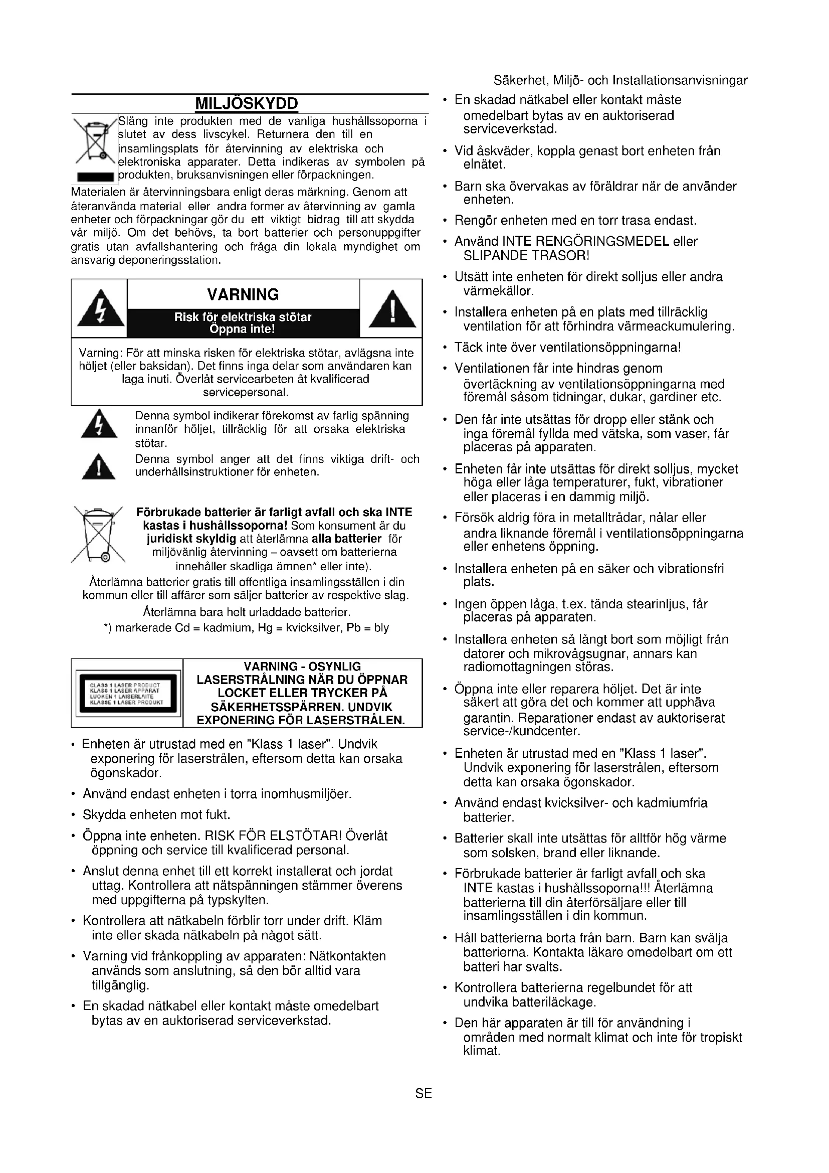 - Enheten är utrustad med en "Klass 1 laser". Undvik exponering för laserstrålen, eftersom detta kan orsaka ögonskador.