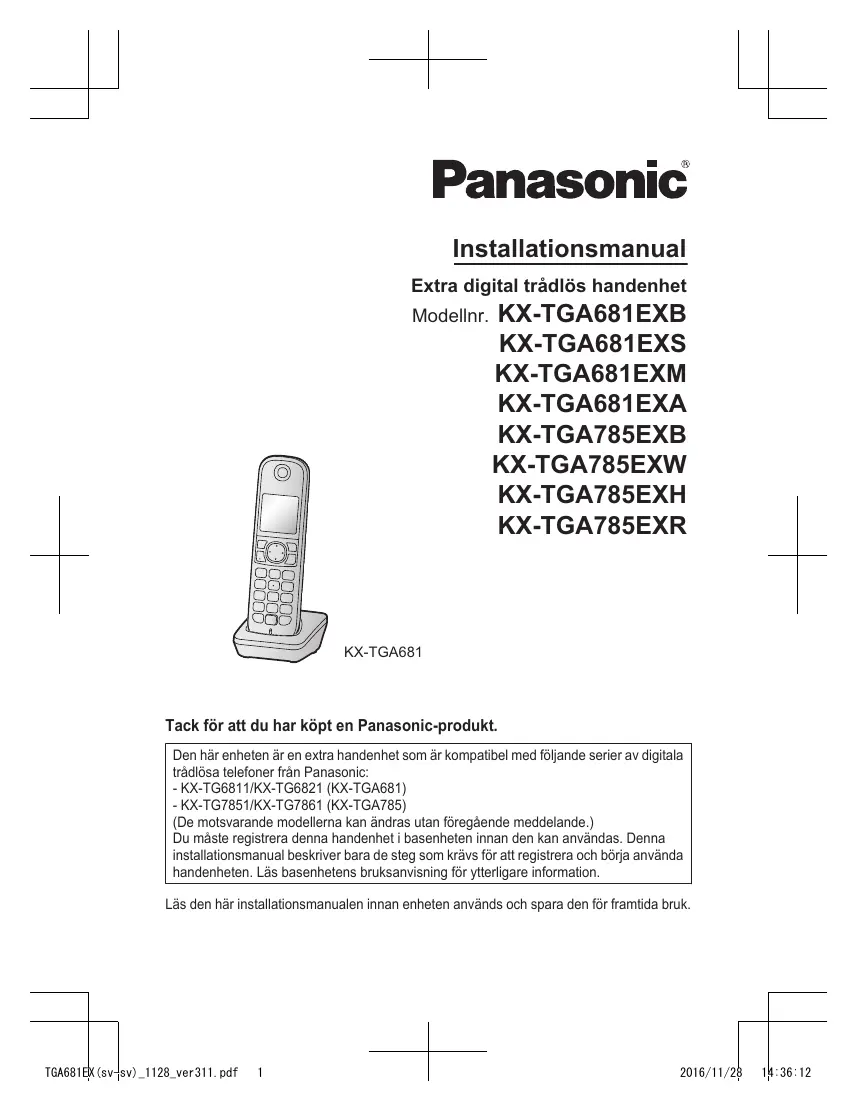 2016/11/28 14:34:04 Installationsmanual Extra digital trådlös handenhet Modellnr. KX-TGA681EXB KX-TGA681EXS KX-TGA681EXM KX-TGA681EXA KX-TGA785EXB KX-TGA785EXW KX-TGA785EXH KX-TGA785EXR KX-TGA681 Tack för att du har köpt en Panasonic-produkt. Den här enheten är en extra handenhet som är kompatibel med följande serier av digitala trådlösa telefoner från Panasonic: - KX-TG6811/KX-TG6821 (KX-TGA681) - KX-TG7851/KX-TG7861 (KX-TGA785) (De motsvarande modellerna kan ändras utan föregående meddelande.) Du måste registrera denna handenhet i basenheten innan den kan användas. Denna installationsmanual beskriver bara de steg som krävs för att registrera och börja använda handenheten. Läs basenhetens bruksanvisning för ytterligare information. Läs den här installationsmanualen innan enheten används och spara den för framtida bruk. TGA681EX(sv-sv)_1128_ver311.pdf
