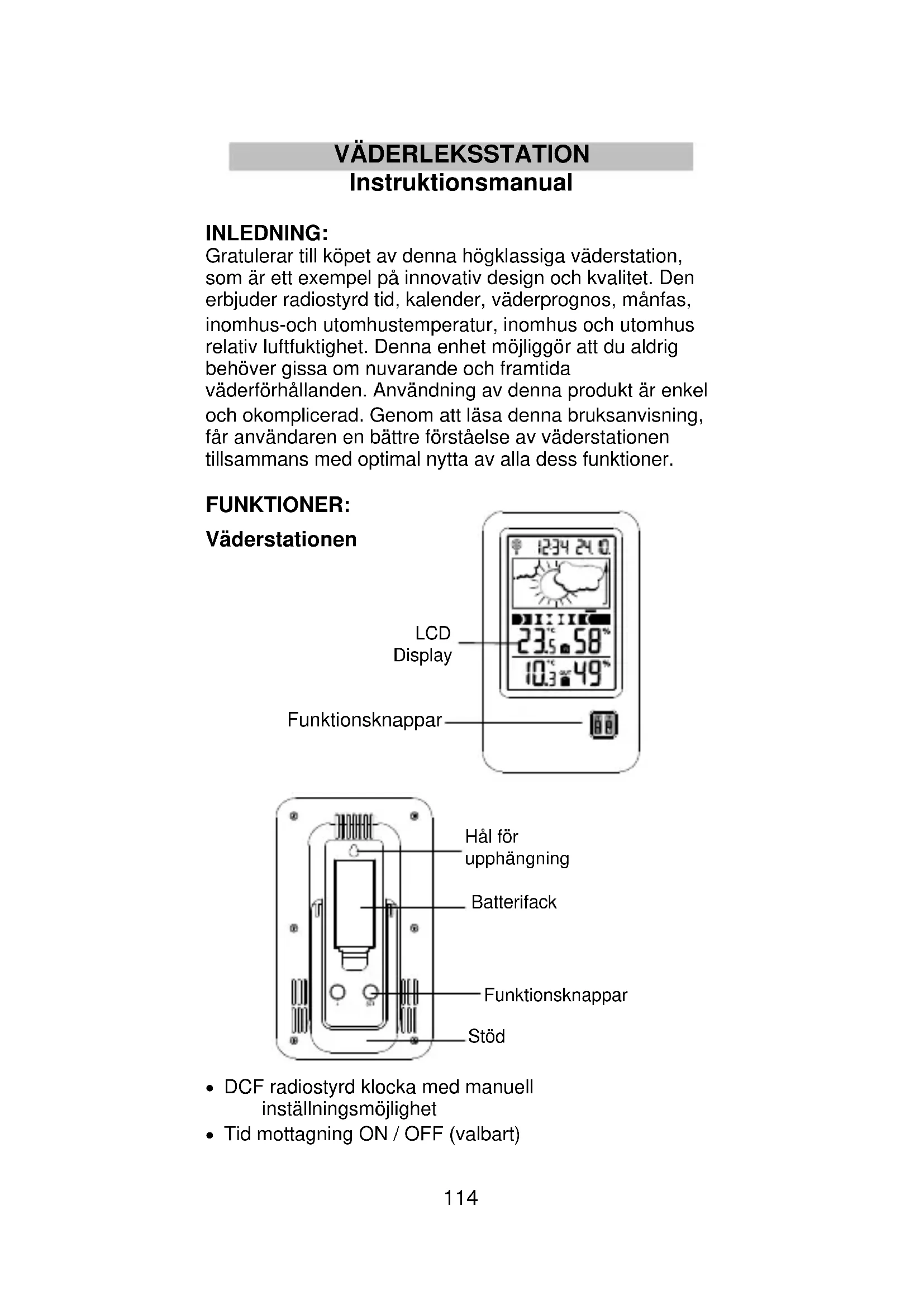 Tiden för den radiostyrda klockan styrs av Cesium Atomic Clock, som drivs av Physikalisch Technische Bundesanstalt Braunschweig. Denna tid har en avvikelse på mindre än en sekund på en miljon år. Tiden kodas och sänds från Mainflingen nära Frankfurt via frekvens signal DCF-77 (77,5 kHz) och har en sändande räckvidd på ca 1500 km. Din radiostyrda väderstation tar emot denna signal och omvandlar den för att visa den exakta tiden i sommar eller vintertid. Kvaliteten på mottagningen beror mycket på det geografiska läget. I normala fall bör det inte finnas något problem för mottagning inom en 1500km radie från Frankfurt. DCF mottagning sker två gånger dagligen kl 02:00 och 03:00 am. Om mottagningen inte lyckas kl 03:00 am, äger nästa mottagning rum den närmaste timmen och så vidare tills 06:00, eller tills mottagningen är bra. Om mottagningen inte lyckas klockan 06:00 am, kommer nästa försök att ske nästa dag vid 02:00. När testperioden för mottagningen av utomhus uppgifter är klar, kommer DCF tornikonen i klockan att börja blinka i övre vänstra hörnet. Detta indikerar att klockan har upptäckt att det finns en radiosignal närvarande och försöker mottaga den. När tidskoden har mottagits, blir DCF tornet ständigt lysande och tiden visas. Om tornet blinkar, men kan inte ställa in tiden eller DCF tornet inte visas alls, vänligen observera följande: Rekommenderat avstånd till alla störande källor såsom datorskärmar eller tv-apparater är minst 1,5 - 2 meter. Inom järn-betong rum t.ex.källare, är den mottagna signalen svag. I extrema fall kan du placera enheten118 + knapp MIN/MAX knapp SET knapp nära ett fönster och rikta fram-eller baksidan mot Frankfurt sändaren. Under natten är de atmosfäriska störningarna oftast mindre allvarliga och mottagning är möjlig i de flesta fall. En enda daglig mottagning är tillräcklig för att hålla noggrannhetsavvikelsen under 1 sekund. FUNKTIONSKNAPPAR: Väderstation: Väderstationen har 3 enkla funktionsknappar: en knapp på framsidan, och två på baksidan