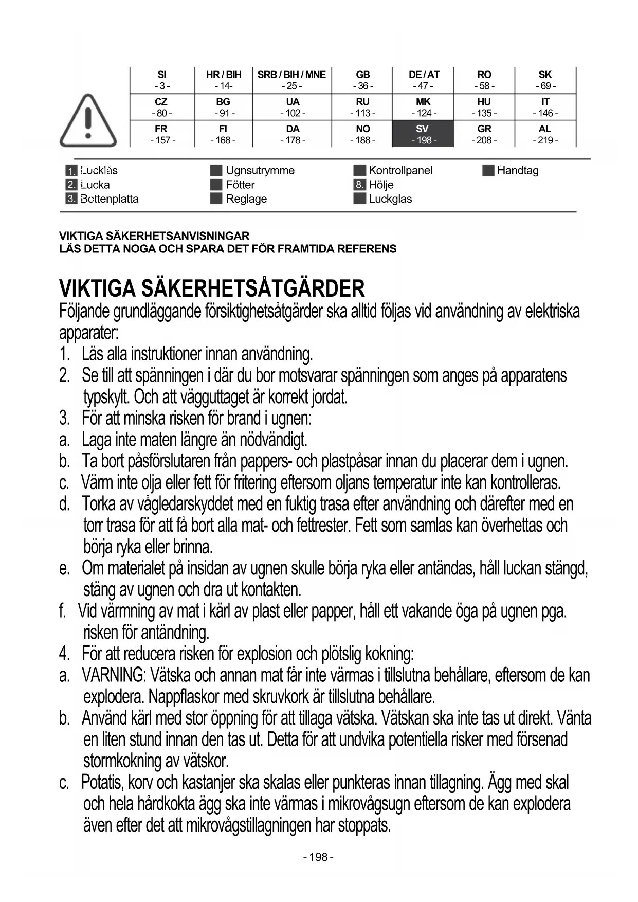 a. VARNING: Vätska och annan mat får inte värmas i tillslutna behållare, eftersom de kan explodera. Nappaskor med skruvkork är tillslutna behållare. b. Använd kärl med stor öppning för att tillaga vätska. Vätskan ska inte tas ut direkt. Vänta en liten stund innan den tas ut. Detta för att undvika potentiella risker med försenad stormkokning av vätskor. c. Potatis, korv och kastanjer ska skalas eller punkteras innan tillagning. Ägg med skal och hela hårdkokta ägg ska inte värmas i mikrovågsugn eftersom de kan explodera även efter det att mikrovågstillagningen har stoppats.