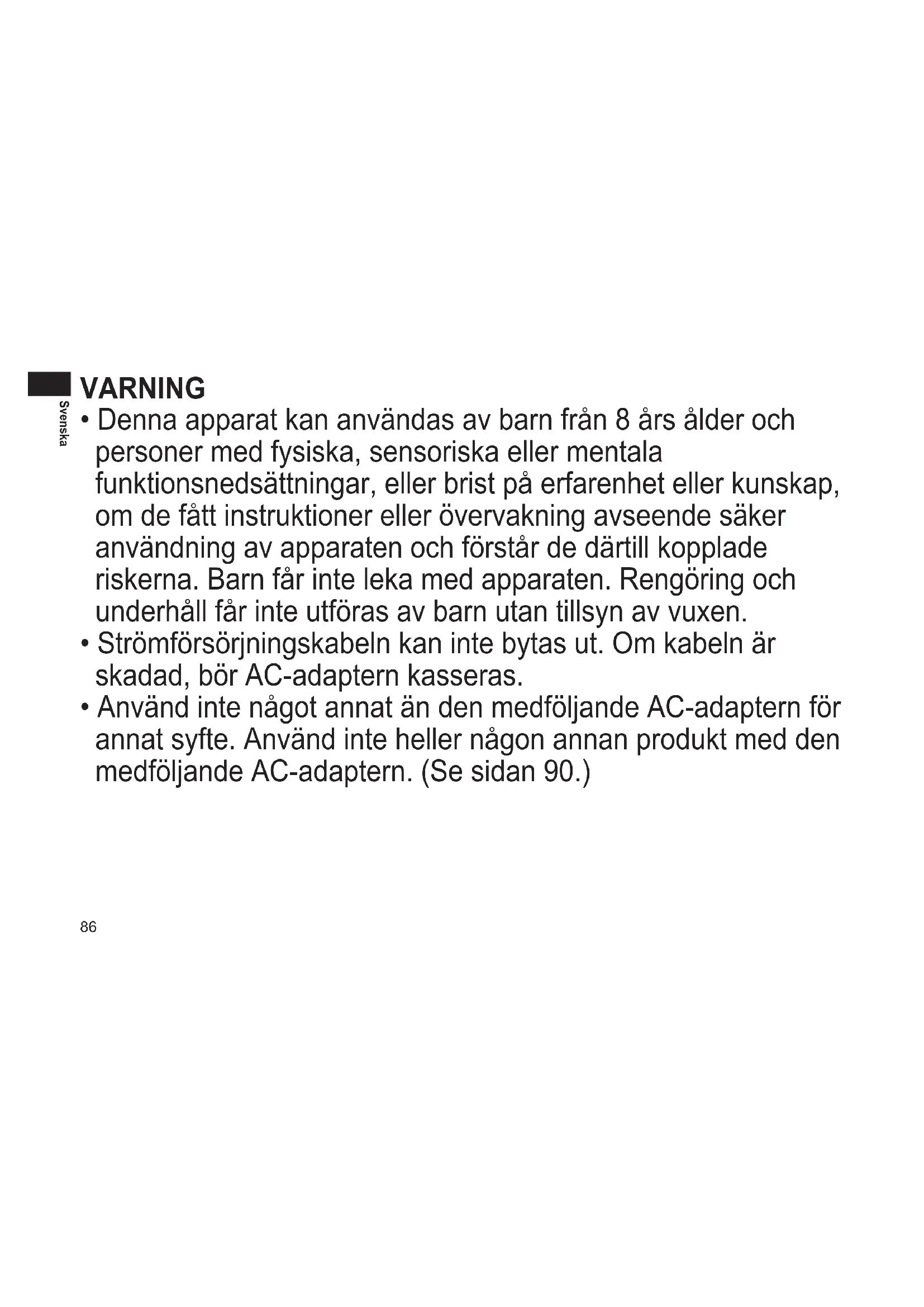 - Använd inte något annat än den medföljande AC-adaptern för annat syfte. Använd inte heller någon annan produkt med den medföljande AC-adaptern. (Se sidan 90.)87 Svenska