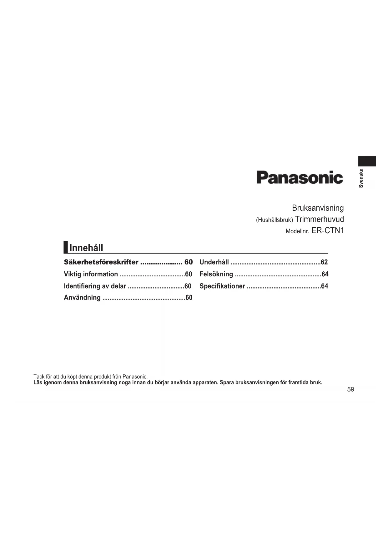- Skift ut bladet. (Se side 57.) Lager en høy lyd. Rengjør bladet og påfør smøreolje. (Se side 57.) Kontroller at bladet er montert riktig. Hvis du fortsatt ikke kan løse problemet, må du kontakte forhandleren eller et serviceverksted som er autorisert av Panasonic for å reparere apparatet. Spesikasjoner Luftbåren akustisk støy 67 (dB (A) re 1 pW) Dette produktet er kun beregnet til husholdningsbruk.59 Svenska Bruksanvisning (Hushållsbruk) Trimmerhuvud Modellnr. ER‑CTN1 Tack för att du köpt denna produkt från Panasonic. Läsigenomdennabruksanvisningnogainnandubörjaranvändaapparaten.Sparabruksanvisningenförframtidabruk. Säkerhetsföreskrifter p. 60
