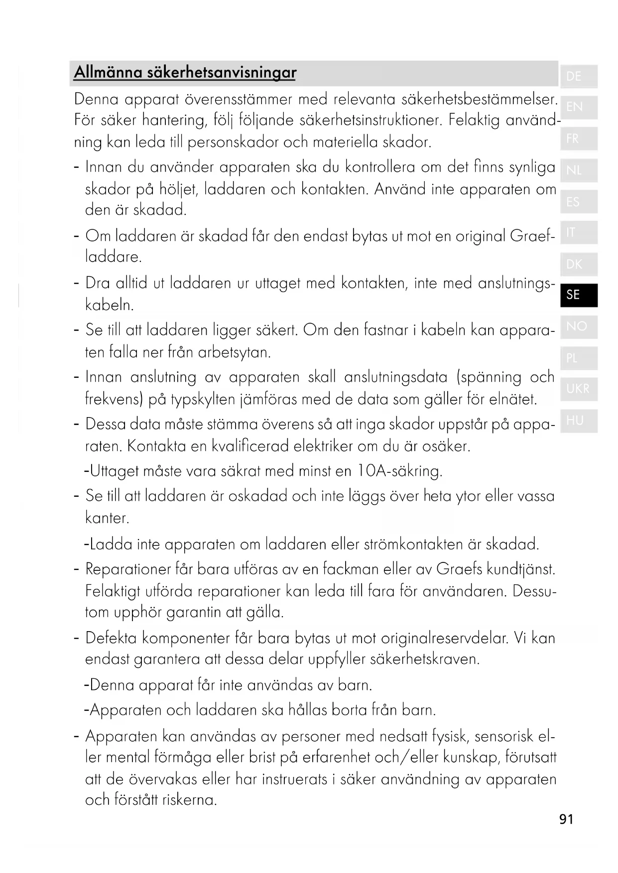 Allmänna säkerhetsanvisningar Denna apparat överensstämmer med relevanta säkerhetsbestämmelser. För säker hantering, följ följande säkerhetsinstruktioner. Felaktig använd- ning kan leda till personskador och materiella skador. - Innan du använder apparaten ska du kontrollera om det finns synliga skador på höljet, laddaren och kontakten. Använd inte apparaten om den är skadad. - Om laddaren är skadad får den endast bytas ut mot en original Graef- laddare. - Dra alltid ut laddaren ur uttaget med kontakten, inte med anslutnings- kabeln. - Se till att laddaren ligger säkert. Om den fastnar i kabeln kan appara- ten falla ner från arbetsytan. - Innan anslutning av apparaten skall anslutningsdata (spänning och frekvens) på typskylten jämföras med de data som gäller för elnätet. - Dessa data måste stämma överens så att inga skador uppstår på appa- raten. Kontakta en kvalificerad elektriker om du är osäker. - Uttaget måste vara säkrat med minst en 10A-säkring. - Se till att laddaren är oskadad och inte läggs över heta ytor eller vassa kanter. - Ladda inte apparaten om laddaren eller strömkontakten är skadad. - Reparationer får bara utföras av en fackman eller av Graefs kundtjänst. Felaktigt utförda reparationer kan leda till fara för användaren. Dessu- tom upphör garantin att gälla. - Defekta komponenter får bara bytas ut mot originalreservdelar. Vi kan endast garantera att dessa delar uppfyller säkerhetskraven. - Denna apparat får inte användas av barn. - Apparaten och laddaren ska hållas borta från barn. - Apparaten kan användas av personer med nedsatt fysisk, sensorisk el- ler mental förmåga eller brist på erfarenhet och/eller kunskap, förutsatt att de övervakas eller har instruerats i säker användning av apparaten och förstått riskerna.92 - Barn får inte leka med apparaten. - Apparaten är inte avsedd att användas med en extern timer eller en separat fjärrstyrning. - Förpackningsmaterialet får inte användas som leksak. Kvävningsrisk kan föreligga. - Innan du monterar, demonterar eller rengör apparaten ska du alltid koppla bort den från elnätet, även när den inte övervakas. - Håll apparaten borta från värme eller vassa kanter som kan orsaka skador. - Håll apparaten borta från andra värmeavgivande apparater. - Sänk inte ner apparaten i vatten eller andra vätskor. - Använd inte apparaten med våta händer. - Utsätt inte apparaten för regn. - Förvara inte apparaten i direkt solljus eller i hög luftfuktighet. - Använd inte denna apparat om en av öppningarna är blockerad. - Använd inte apparaten för att suga upp lättantändliga vätskor, tänd- stickor, cigarettfimpar, het aska eller andra heta, brinnande eller rykan- de föremål. - Använd inte denna apparat för att plocka upp hårda, vassa föremål som glas, spik eller liknande. - Använd inte apparaten för att suga upp vatten eller andra vätskor, ef- tersom det föreligger risk för elstöt. - Använd aldrig apparaten utan filtret.93