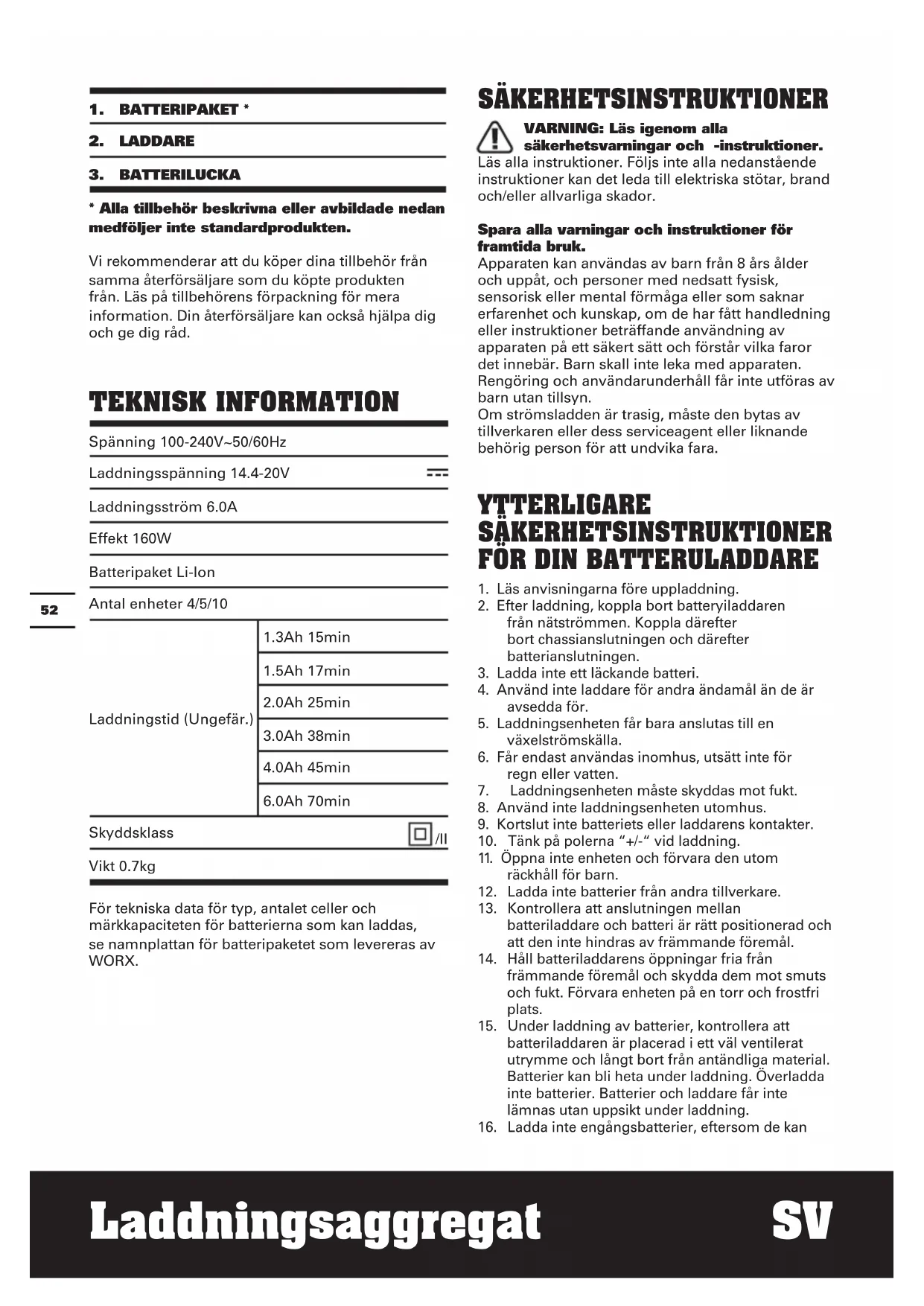 - Alla tillbehör beskrivna eller avbildade nedan medföljer inte standardprodukten. Vi rekommenderar att du köper dina tillbehör från samma återförsäljare som du köpte produkten från. Läs på tillbehörens förpackning för mera information. Din återförsäljare kan också hjälpa dig och ge dig råd. TEKNISK INFORMATION Spänning 100-240V~50/60Hz Laddningsspänning 14.4-20V Laddningsström 6.0A Effekt 160W Batteripaket Li-Ion Antal enheter 4/5/10 Laddningstid (Ungefär.) 1.3Ah 15min 1.5Ah 17min 2.0Ah 25min 3.0Ah 38min 4.0Ah 45min 6.0Ah 70min Skyddsklass /II Vikt 0.7kg För tekniska data för typ, antalet celler och märkkapaciteten för batterierna som kan laddas, se namnplattan för batteripaketet som levereras av WORX. SÄKERHETSINSTRUKTIONER VARNING: Läs igenom alla säkerhetsvarningar och -instruktioner. Läs alla instruktioner. Följs inte alla nedanstående instruktioner kan det leda till elektriska stötar, brand och/eller allvarliga skador. Spara alla varningar och instruktioner för framtida bruk. Apparaten kan användas av barn från 8 års ålder och uppåt, och personer med nedsatt fysisk, sensorisk eller mental förmåga eller som saknar erfarenhet och kunskap, om de har fått handledning eller instruktioner beträffande användning av apparaten på ett säkert sätt och förstår vilka faror det innebär. Barn skall inte leka med apparaten. Rengöring och användarunderhåll får inte utföras av barn utan tillsyn. Om strömsladden är trasig, måste den bytas av tillverkaren eller dess serviceagent eller liknande behörig person för att undvika fara. YTTERLIGARE SÄKERHETSINSTRUKTIONER