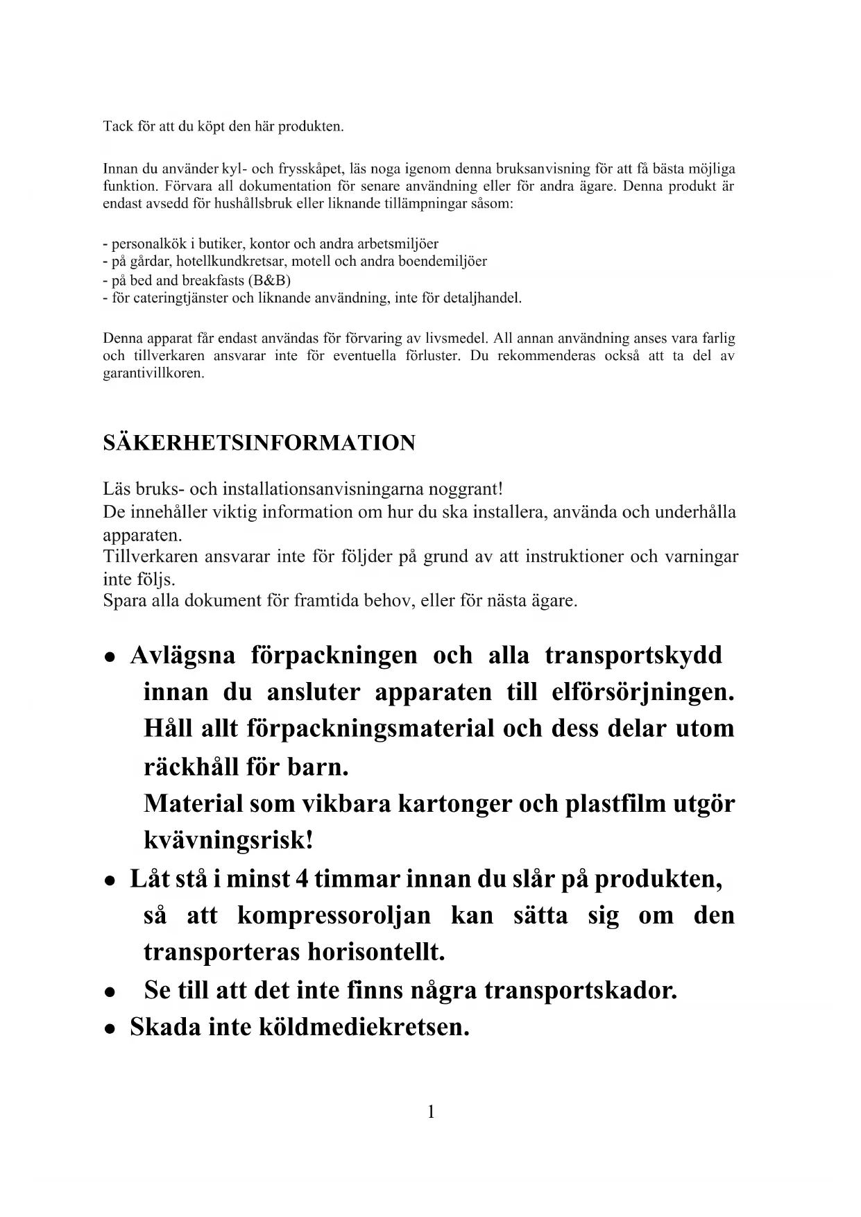 Tack för att du köpt den här produkten. Innan du använder kyl- och frysskåpet, läs noga igenom denna bruksanvisning för att få bästa möjliga funktion. Förvara all dokumentation för senare användning eller för andra ägare. Denna produkt är endast avsedd för hushållsbruk eller liknande tillämpningar såsom: - personalkök i butiker, kontor och andra arbetsmiljöer - på gårdar, hotellkundkretsar, motell och andra boendemiljöer - på bed and breakfasts (B&B) - för cateringtjänster och liknande användning, inte för detaljhandel. Denna apparat får endast användas för förvaring av livsmedel. All annan användning anses vara farlig och tillverkaren ansvarar inte för eventuella förluster. Du rekommenderas också att ta del av garantivillkoren. SÄKERHETSINFORMATION Läs bruks- och installationsanvisningarna noggrant! De innehåller viktig information om hur du ska installera, använda och underhålla apparaten. Tillverkaren ansvarar inte för följder på grund av att instruktioner och varningar inte följs. Spara alla dokument för framtida behov, eller för nästa ägare. ● Avlägsna förpackningen och alla transportskydd innan du ansluter apparaten till elförsörjningen. Håll allt förpackningsmaterial och dess delar utom räckhåll för barn. Material som vikbara kartonger och plastfilm utgör kvävningsrisk! ● Låt stå i minst 4 timmar innan du slår på produkten, så att kompressoroljan kan sätta sig om den transporteras horisontellt. ● Se till att det inte finns några transportskador. ● Skada inte köldmediekretsen.