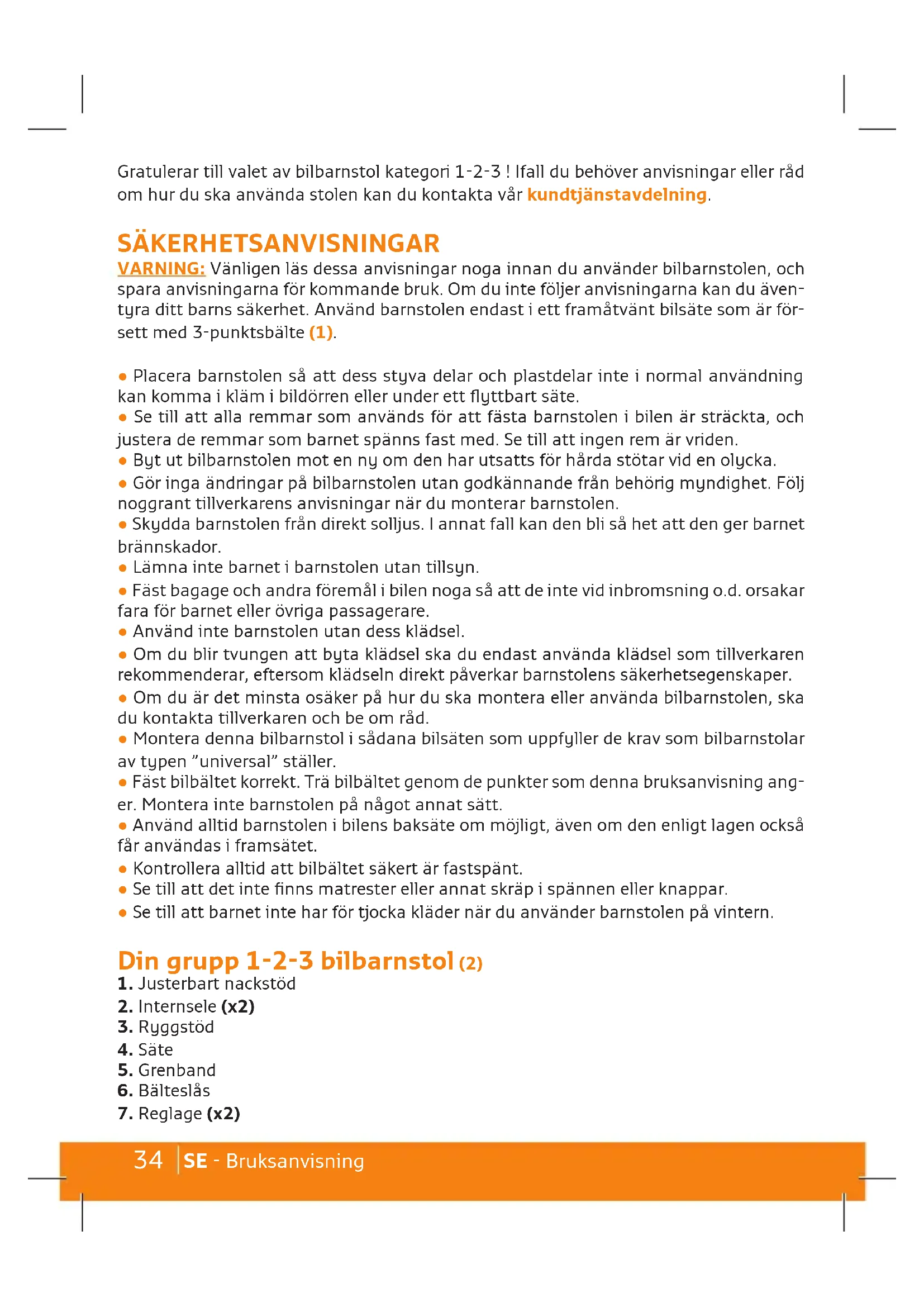 - Hvis De er I tvivl, kontakt da enten producenten eller forhandleren af denne stol.34 SE - Bruksanvisning Gratulerar till valet av bilbarnstol kategori 1-2-3 ! Ifall du behöver anvisningar eller råd om hur du ska använda stolen kan du kontakta vår kundtjänstavdelning. SÄKERHETSANVISNINGAR VARNING: Vänligen läs dessa anvisningar noga innan du använder bilbarnstolen, och spara anvisningarna för kommande bruk. Om du inte följer anvisningarna kan du även- tyra ditt barns säkerhet. Använd barnstolen endast i ett framåtvänt bilsäte som är för- sett med 3-punktsbälte (1).