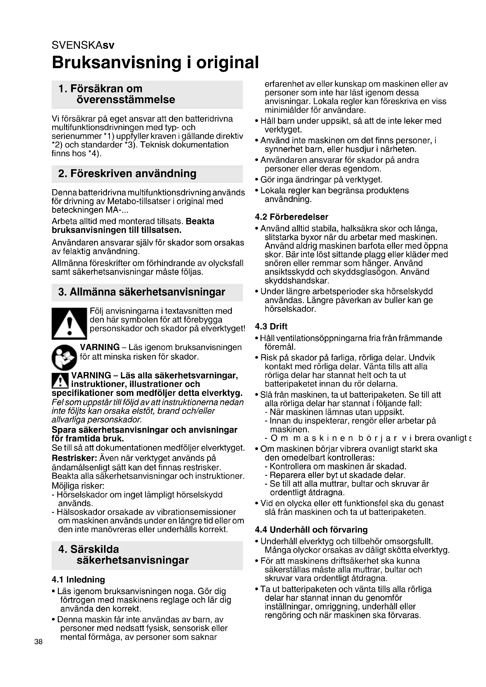 Bruksanvisning i original Vi försäkrar på eget ansvar att den batteridrivna multifunktionsdrivningen med typ- och serienummer *1) uppfyller kraven i gällande direktiv *2) och standarder *3). Teknisk dokumentation finns hos *4). Denna batteridrivna multifunktionsdrivning används för drivning av Metabo-tillsatser i original med beteckningen MA-... Arbeta alltid med monterad tillsats. Beakta bruksanvisningen till tillsatsen. Användaren ansvarar själv för skador som orsakas av felaktig användning. Allmänna föreskrifter om förhindrande av olycksfall samt säkerhetsanvisningar måste följas. Följ anvisningarna i textavsnitten med den här symbolen för att förebygga personskador och skador på elverktyget! VARNING – Läs igenom bruksanvisningen för att minska risken för skador. VARNING – Läs alla säkerhetsvarningar, instruktioner, illustrationer och specifikationer som medföljer detta elverktyg. Fel som uppstår till följd av att instruktionerna nedan inte följts kan orsaka elstöt, brand och/eller allvarliga personskador. Spara säkerhetsanvisningar och anvisningar för framtida bruk. Se till så att dokumentationen medföljer elverktyget. Restrisker: Även när verktyget används på ändamålsenligt sätt kan det finnas restrisker. Beakta alla säkerhetsanvisningar och instruktioner. Möjliga risker: - Hörselskador om inget lämpligt hörselskydd används. - Hälsoskador orsakade av vibrationsemissioner om maskinen används under en längre tid eller om den inte manövreras eller underhålls korrekt.