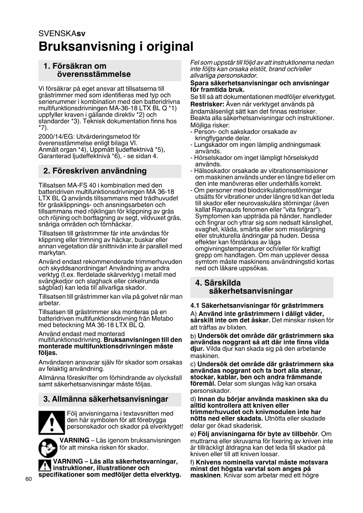 Bruksanvisning i original Vi försäkrar på eget ansvar att tillsatserna till grästrimmer med som identifieras med typ och serienummer i kombination med den batteridrivna multifunktionsdrivningen MA-36-18 LTX BL Q *1) uppfyller kraven i gällande direktiv *2) och standarder *3). Teknisk dokumentation finns hos *7). 2000/14/EG: Utvärderingsmetod för överensstämmelse enligt bilaga VI. Anmält organ *4), Uppmätt ljudeffektnivå *5), Garanterad ljudeffektnivå *6), - se sidan 4. Tillsatsen MA-FS 40 i kombination med den batteridriven multifunktionsdrivningen MA 36-18 LTX BL Q används tillsammans med trådhuvudet för gräsklippnings- och ansningsarbeten och tillsammans med röjklingan för klippning av gräs och röjning och borttagning av segt, vildvuxet gräs, snåriga områden och törnhäckar. Tillsatsen till grästrimmer får inte användas för klippning eller trimning av häckar, buskar eller annan vegetation där snittnivån inte är parallell med markytan. Använd endast rekommenderade trimmerhuvuden och skyddsanordningar! Användning av andra verktyg (t.ex. flerdelade skärverktyg i metall med svängkedjor och slaghack eller cirkelrunda sågblad) kan leda till allvarliga skador. Tillsatsen till grästrimmer kan vila på golvet när man arbetar. Tillsatsen till grästrimmer ska monteras på en batteridriven multifunktionsdrivning från Metabo med beteckning MA 36-18 LTX BL Q. Använd endast med monterad multifunktionsdrivning. Bruksanvisningen till den monterade multifunktionsdrivningen måste följas. Användaren ansvarar själv för skador som orsakas av felaktig användning. Allmänna föreskrifter om förhindrande av olycksfall samt säkerhetsanvisningar måste följas. Följ anvisningarna i textavsnitten med den här symbolen för att förebygga personskador och skador på elverktyget! VARNING – Läs igenom bruksanvisningen för att minska risken för skador. VARNING – Läs alla säkerhetsvarningar, instruktioner, illustrationer och specifikationer som medföljer detta elverktyg. Fel som uppstår till följd av att instruktionerna nedan inte följts kan orsaka elstöt, brand och/eller allvarliga personskador. Spara säkerhetsanvisningar och anvisningar för framtida bruk. Se till så att dokumentationen medföljer elverktyget. Restrisker: Även när verktyget används på ändamålsenligt sätt kan det finnas restrisker. Beakta alla säkerhetsanvisningar och instruktioner. Möjliga risker: - Person- och sakskador orsakade av kringflygande delar. - Lungskador om ingen lämplig andningsmask används. - Hörselskador om inget lämpligt hörselskydd används. - Hälsoskador orsakade av vibrationsemissioner om maskinen används under en längre tid eller om den inte manövreras eller underhålls korrekt. - Om personer med blodcirkulationsstörningar utsätts för vibrationer under längre tid kan det leda till skador eller neurovaskulära störningar (även kallat Raynauds fenomen eller ”vita fingrar”). Symptomen kan uppträda på händer, handleder och fingrar och yttrar sig som nedsatt känslighet, svaghet, klåda, smärta eller som missfärgning eller strukturella ändringar på huden. Dessa effekter kan förstärkas av låga omgivningstemperaturer och/eller för kraftigt grepp om handtagen. Om man upplever dessa symtom måste maskinens användningstid kortas ned och läkare uppsökas.