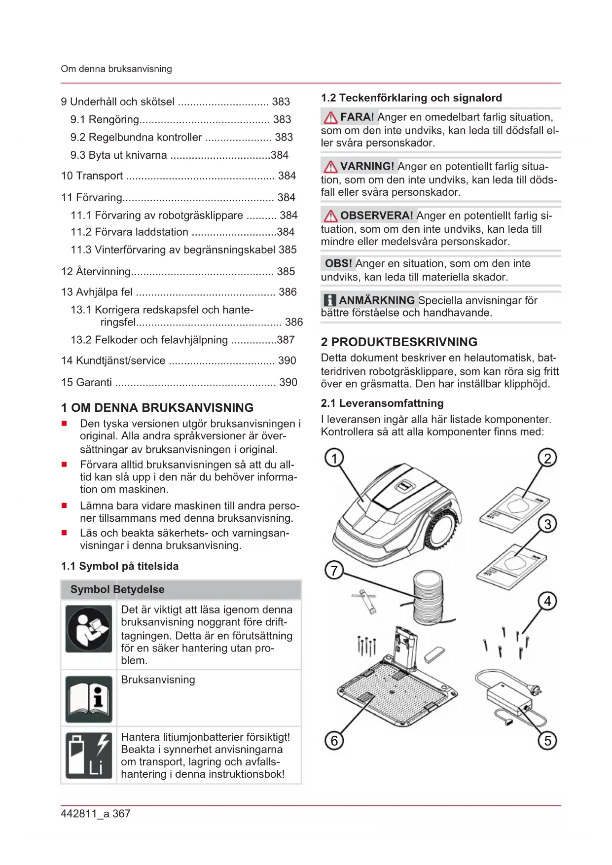 FARA! Anger en omedelbart farlig situation, som om den inte undviks, kan leda till dödsfall el- ler svåra personskador. VARNING! Anger en potentiellt farlig situa- tion, som om den inte undviks, kan leda till döds- fall eller svåra personskador. OBSERVERA! Anger en potentiellt farlig si- tuation, som om den inte undviks, kan leda till mindre eller medelsvåra personskador. OBS! Anger en situation, som om den inte undviks, kan leda till materiella skador. ANMÄRKNING Speciella anvisningar för bättre förståelse och handhavande. 2 PRODUKTBESKRIVNING Detta dokument beskriver en helautomatisk, bat- teridriven robotgräsklippare, som kan röra sig fritt över en gräsmatta. Den har inställbar klipphöjd.