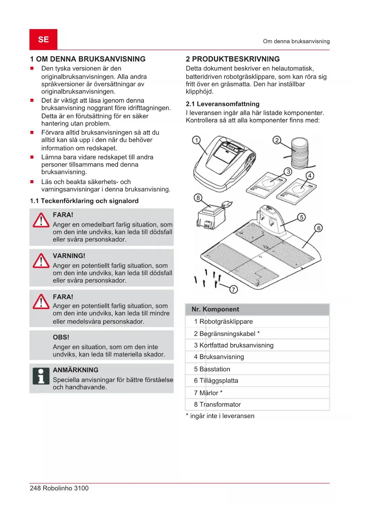Symbol Betydelse Håll utomstående borta från riskområdet! Iaktta särskild försiktighet under hanteringen! Håll händer och fötter på avstånd från knivarna! Håll tillräckligt långt säkerhetsavstånd! Läs bruksanvisningen före idrifttagningen! Ange PIN-kod för att starta redskapet! Åk inte på redskapet!SE 250 Robolinho 3100 Produktbeskrivning