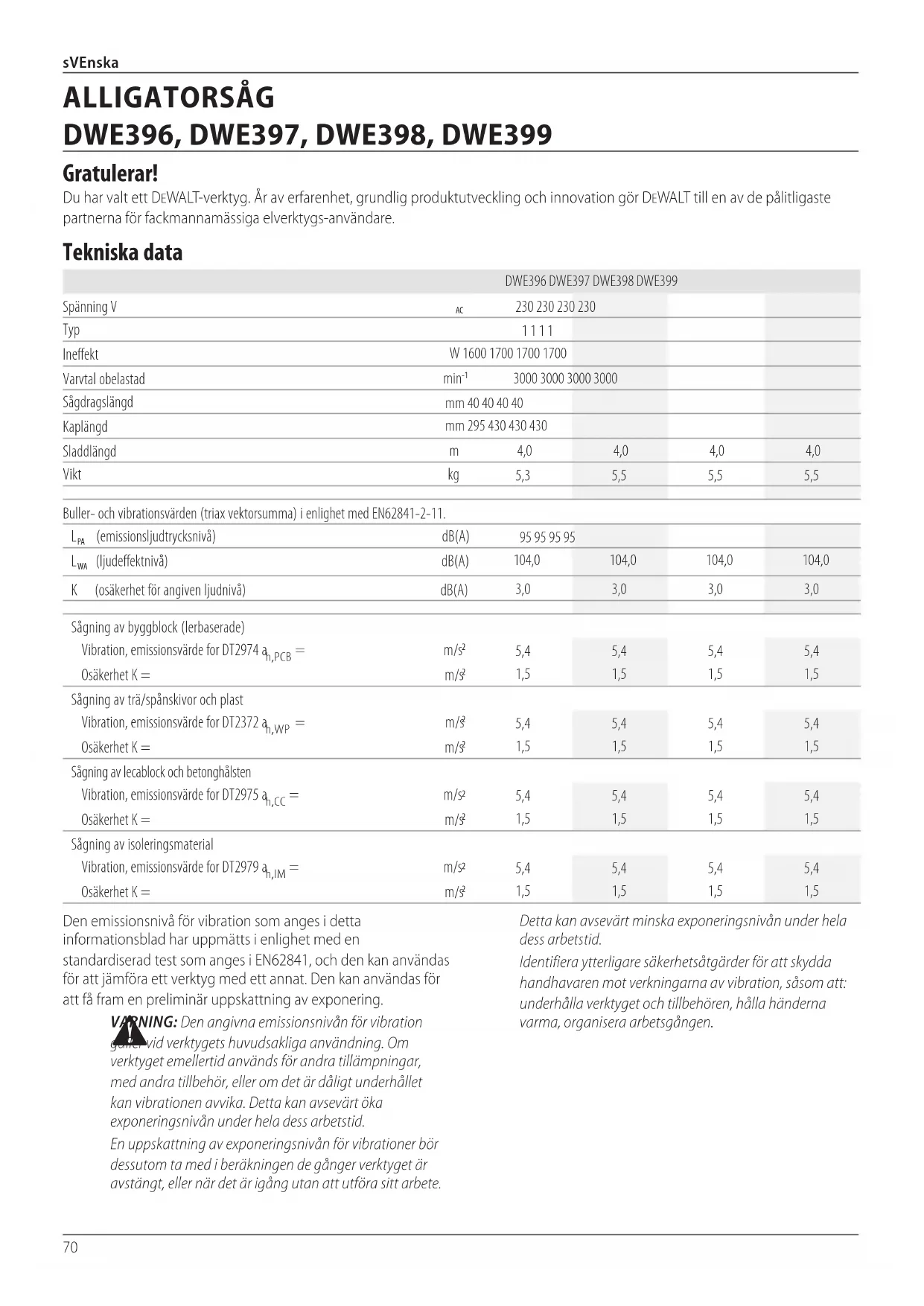 Dammpor Avsedd Användning Din DeWALT alligatorsåg DWE396, DWE397, DWE398 och DWE399 har designats för professionell sågning av byggblock, lättbetong, trä, plast och isoleringsmaterial med lämpliga sågblad. Använd IntE under våta förhållanden eller i närheten av lättantändliga vätskor ellergaser. Låt IntE barn komma i kontakt med verktyget. Överinseende krävs när oerfarna handhavare använder dettaverktyg.