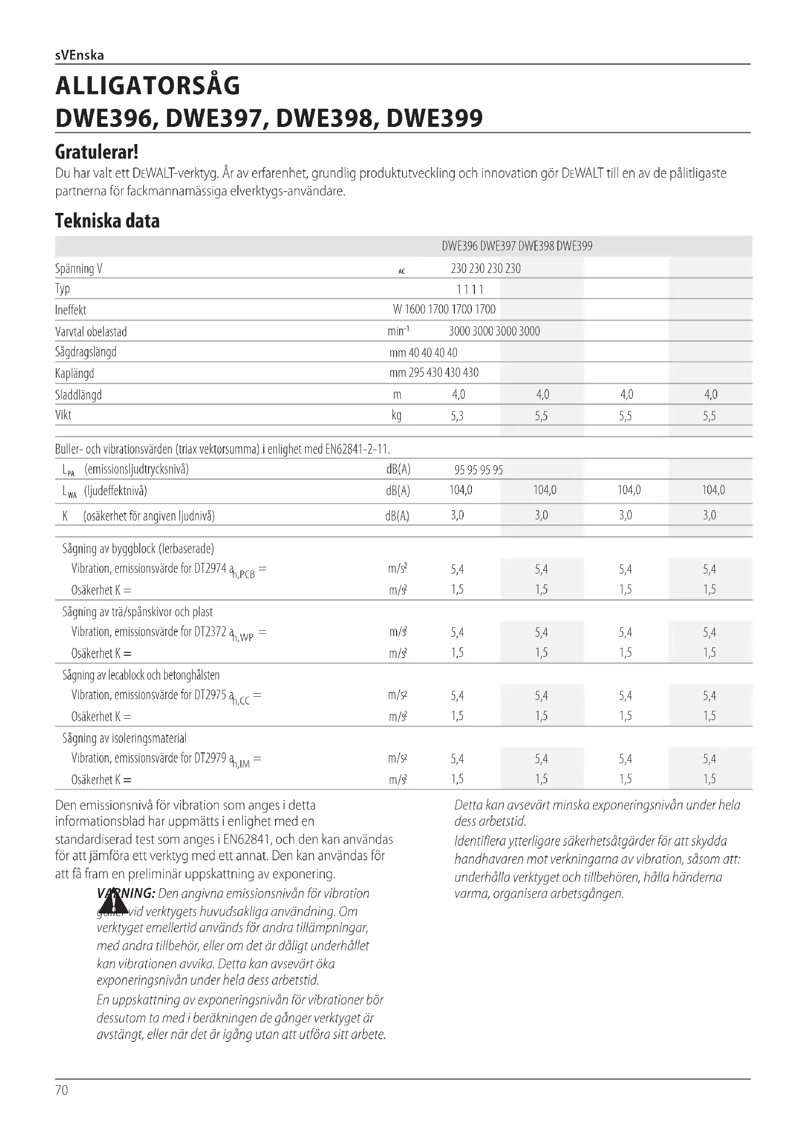 Dammpor Avsedd Användning Din DeWALT alligatorsåg DWE396, DWE397, DWE398 och DWE399 har designats för professionell sågning av byggblock, lättbetong, trä, plast och isoleringsmaterial med lämpliga sågblad. Använd IntE under våta förhållanden eller i närheten av lättantändliga vätskor ellergaser. Låt IntE barn komma i kontakt med verktyget. Överinseende krävs när oerfarna handhavare använder dettaverktyg.