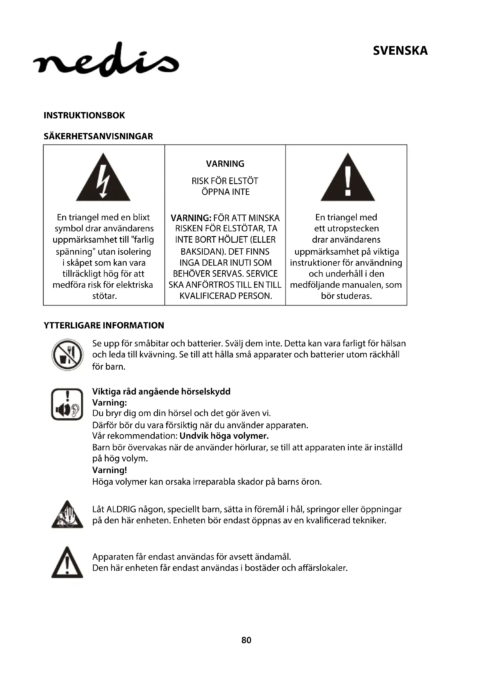 KVALIFICERAD PERSON. En triangel med ett utropstecken drar användarens uppmärksamhet på viktiga instruktioner för användning och underhåll i den medföljande manualen, som bör studeras. YTTERLIGARE INFORMATION Se upp för småbitar och batterier. Svälj dem inte. Detta kan vara farligt för hälsan och leda till kvävning. Se till att hålla små apparater och batterier utom räckhåll för barn. Viktiga råd angående hörselskydd Varning: Du bryr dig om din hörsel och det gör även vi. Därför bör du vara försiktig när du använder apparaten. Vår rekommendation: Undvik höga volymer. Barn bör övervakas när de använder hörlurar, se till att apparaten inte är inställd på hög volym. Varning! Höga volymer kan orsaka irreparabla skador på barns öron. Låt ALDRIG någon, speciellt barn, sätta in föremål i hål, springor eller öppningar på den här enheten. Enheten bör endast öppnas av en kvalicerad tekniker. Apparaten får endast användas för avsett ändamål. Den här enheten får endast användas i bostäder och aärslokaler.81 SVENSKA Spara handboken för framtida användning. Instruktioner för miljöskydd Släng inte denna produkt i de vanliga hushållssoporna i slutet av dess livscykel, lämna in den på en uppsamlingsplats för återvinning av elektriska och elektroniska apparater. Symbolen på produkten, bruksanvisningen eller förpackningen informerar om kasseringsmetoder. Materialen är återvinningsbara enligt dess märkning. Genom återvinning, materialåtervinning eller andra former av återanvändning av gamla apparater bidrar du till att skydda vår miljö. Hör med din kommun om lokala regler för bortskaelse. Blockera inte enhetens ventilation. Se till att inga gardiner, tidningar, möbler eller någon annan typ av objekt blockerar apparatens ventilationssystem. Ventilationssystemet måste vara fritt från föremål hela tiden! Överhettning kan leda till allvarlig skada på enheten och minska dess prestanda och livslängd. Hetta och värme Utsätt inte apparaten för direkt solljus. Se till att apparaten inte utsätts för direkta värmekällor som värmeelement eller öppen eld. Se till att apparatens ventilationsöppningar inte är förtäckta. Fukt och rengöring Apparaten är inte vattentät! Doppa inte spelaren i vatten. Låt inte spelaren komma i kontakt med vatten. Om vatten kommer in i spelaren kan det orsaka allvarliga skador. Använd inte rengöringsmedel som innehåller alkohol, ammoniak, bensen eller slipmedel eftersom dessa kan skada spelaren. Använd en mjuk, fuktad trasa för rengöring. Professionell återvinning Batterier och förpackningar ska inte kastas i soporna. Batterier ska lämnas till en uppsamlingscentral för använda batterier. Det är miljövänligt att separera engångsförpackningsmaterial.