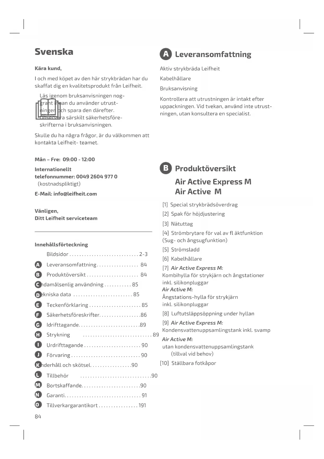 Leveransomfattning Svenska Kära kund, I och med köpet av den här strykbrädan har du skaffat dig en kvalitetsprodukt från Leifheit. Läs igenom bruksanvisningen nog- grant innan du använder utrust- ningen och spara den därefter. Observera särskilt säkerhetsföre- skrifterna i bruksanvisningen. Skulle du ha några frågor, är du välkommen att kontakta Leifheit- teamet. Mån – Fre: 09:00 - 12:00 Internationellt telefonnummer: 0049 2604 977 0 (kostnadspliktigt) E-Mail: info@leifheit.com Vänligen, Ditt Leifheit serviceteam Air Active Express M Air Active M [1] Special strykbrädsöverdrag [2] Spak för höjdjustering [3] Nätuttag [4] Strömbrytareförvalaväktfunktion (Sug- och ångsugfunktion) [5] Strömsladd [6] Kabelhållare [7] Air Active Express M: Kombihylla för strykjärn och ångstationer inkl. silikonpluggar Air Active M: Ångstations-hylla för strykjärn inkl. silikonpluggar [8] Luftutsläppsöppning under hyllan [9] Air Active Express M: Kondensvattenuppsamlingstank inkl. svamp Air Active M: utan kondensvattenuppsamlingstank (tillval vid behov) [10] Ställbara fotkåpor Produktöversikt