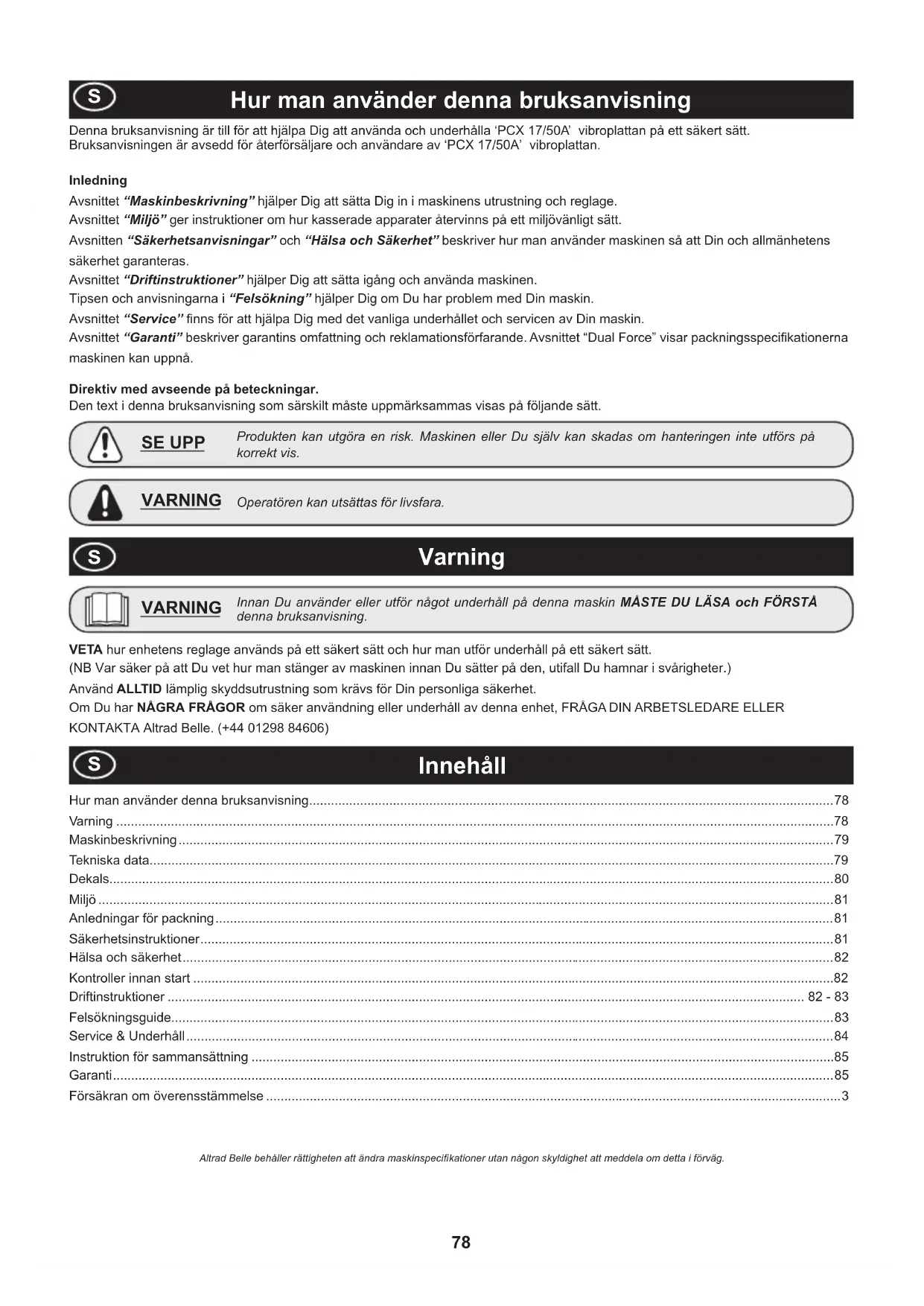 Innan Du använder eller utför något underhåll på denna maskin MÅSTE DU LÄSA och FÖRSTÅ denna bruksanvisning. VARNING Innehåll