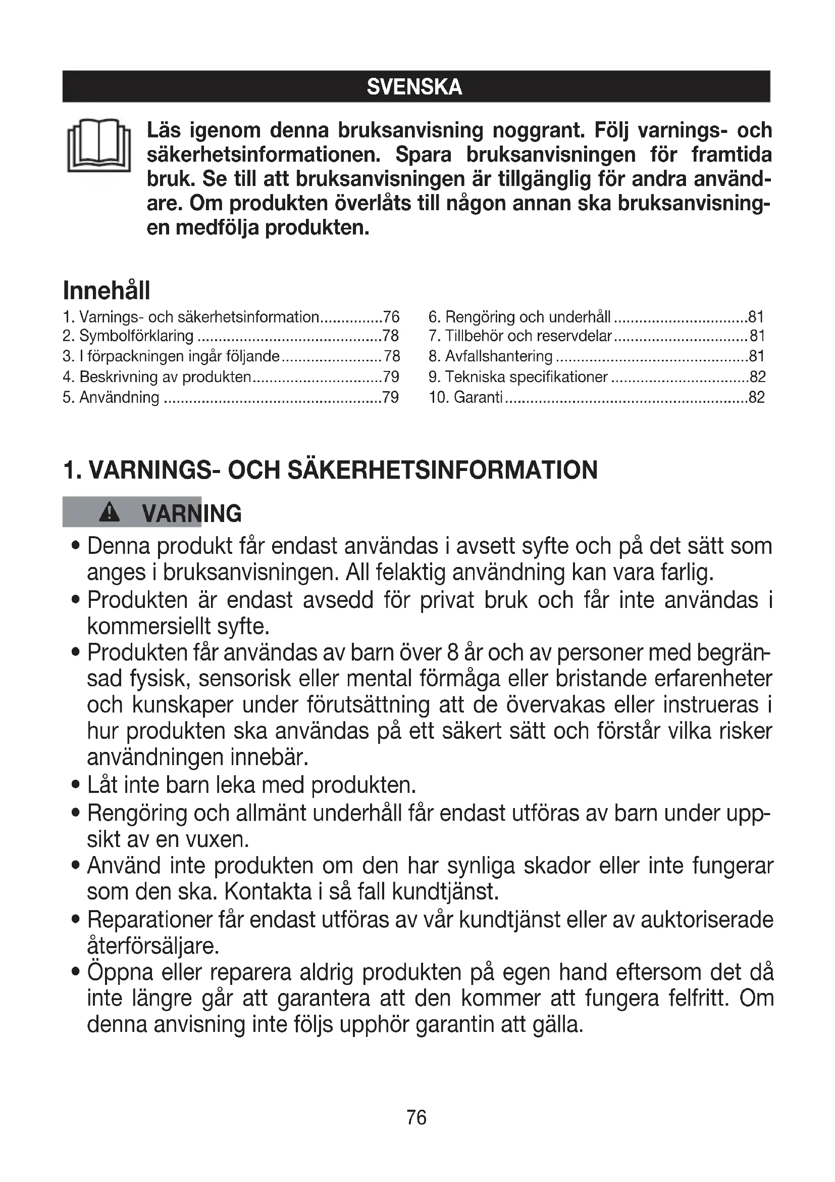 Nærmere oplysninger om garantien og garantibetingelserne findes i det medfølgende garantihæfte. Med forbehold for fejl og ændringer76 Läs igenom denna bruksanvisning noggrant. Följ varnings- och säkerhetsinformationen. Spara bruksanvisningen för framtida bruk. Se till att bruksanvisningen är tillgänglig för andra använd- are. Om produkten överlåts till någon annan ska bruksanvisning