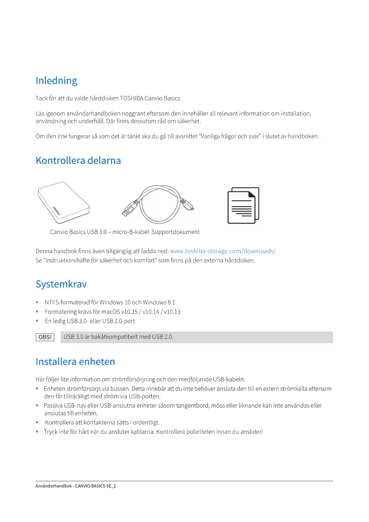 När jag formaterar enheten får jag meddelandet ”Could not complete format” (Det går inte att slutföra formateringen). S: Detta kan inträffa om du formaterar enheten med filsystemet FAT. Prova att välja filsystemet ”NTFS”. Detta borde lösa problemet. Support för TOSHIBA Behöver du hjälp? Gå in på produktsupportsidan för TOSHIBAs hårddisk på: www.toshiba-storage.com/support Om det gäller garantianspråk går du till: www.toshiba-storage.com/warranty-claims Bestämmelser CE-märkning När du formaterar enheten kommer alla data på den att tas bort. Produkten är CE-märkt i enlighet med tillämpliga EU-direktiv. Ansvarig för CE-märkning är Toshiba Electronics Europe GmbH, Hansaallee 181, 40549 Düsseldorf, Tyskland. OBS!Användarhandbok - CANVIO BASICS SE_7 Arbetsmiljö Den här produkten uppfyller EMC-standarden (Electromagnetic Compliance) för den aktuella produktkategorin med avseende på hemmiljö, kommersiell miljö och lätt industri. Övriga arbetsmiljöer har inte kontrollerats av Toshiba vilket medför att användning av produkten i dessa miljöer kan omfattas av begränsningar eller inte kan rekommenderas. Om produkten används i icke-kontrollerade miljöer kan konsekvenserna vara: Störningar av andra produkter eller i den här produkten med temporära tekniska fel eller dataförluster som följd. Exempel på icke bekräftade arbetsmiljöer och relevanta råd: Industrimiljöer (dvs. miljöer där 3-fas 380 V används). Här kan störningar i produkten skapas på grund av de starka elektromagnetiska fälten, speciellt i närheten av stora maskiner eller kraftanläggningar. Medicinska miljöer: Toshiba har inte kontrollerat om produkten uppfyller kraven i det medicintekniska direktivet. Detta medför att produkten inte får användas som en medicinteknisk produkt utan ytterligare verifikationer. All användning i vanliga kontorsmiljöer t.ex. på sjukhus ska inte vara något problem om det inte finns lokala bestämmelser som motsäger detta. Fordonsmiljöer: Kontrollera ägarhandboken för det aktuella fordonet om det finns något om användning av produkter i den här kategorin. Flygplansmiljöer: Följ flygpersonalens anvisningar gällande begränsningar i användningen. Ytterligare miljöer som inte omfattas av EMC-specifikationerna Användning utomhus: Som annan vanlig hem-/kontorsutrustning har den här produkten inget särskilt skydd mot fukt eller kraftiga stötar. Explosiva miljöer: Det är inte tillåtet att använda den här produkten i explosiva miljöer. Följande information gäller endast för EU:s medlemsstater: REACH – Uttalande om uppfyllelse Toshiba har för avsikt att uppfylla alla krav enligt REACH och kommer att ge kunderna information om kemiska ämnen i produkterna enligt bestämmelserna i REACH. Deponering av produkter Följande information gäller endast för Turkiet: Uppfyller villkoren i AEEE-reglementet. Symbolen används för att ange att den här produkten inte kan hanteras som hushållsavfall. Genom att kassera denna produkt på rätt sätt hjälper du till att skydda miljön och människors hälsa från eventuella negativa konsekvenser, som kan uppkomma genom felaktig kassering av denna produkt. Om du vill ha mer detaljerad information om återvinning av denna produkt kontaktar du de lokala myndigheter som sköter avfallshanteringen där du bor eller den affär där du köpte produkten.Meddelanden ©2020 TOSHIBA Electronics Europe GmbH. Med ensamrätt. TOSHIBA förbehåller sig rätten att göra tekniska ändringar. TOSHIBA påtar sig inget ansvar för skador som inträffar direkt eller indirekt av fel, på grund av försummelse eller avvikelser mellan produkten och dokumentationen. Namnet Toshiba och dess logotyper är registrerade varumärken som tillhör Toshiba. macOS är ett registrerat varumärke som tillhör Apple Inc. Alla andra företagsnamn, produktnamn och tjänstenamn är varumärken som tillhör respektive företag. Produktspecifikationer, konfigurationer, färger, komponenter och tjänster kan ändras utan förvarning. En gigabyte (GB) betyder en miljard byte och en terabyte (TB) betyder en biljon byte. Den totala tillgängliga kapaciteten varierar beroende på driftsmiljön, och dina resultat och din lagringskapacitet varierar därefter. Ett operativsystem rapporterar dock lagringskapacitet med hjälp av tvåpotenser för definitionen av 1 TB = 2