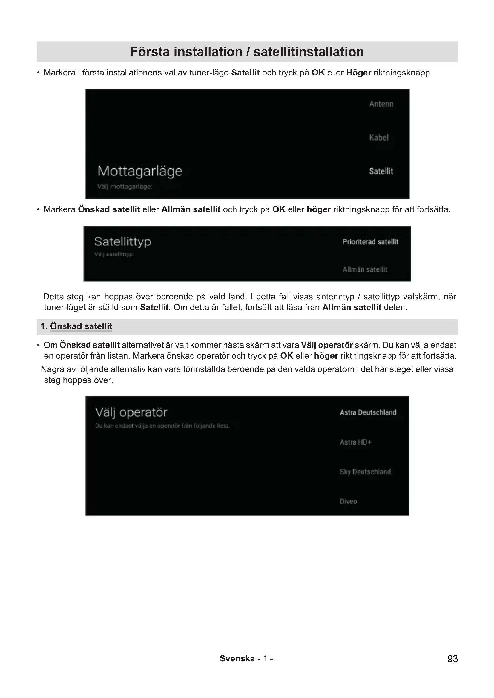 - Om Önskad satellit alternativet är valt kommer nästa skärm att vara Välj operatör skärm. Du kan välja endast en operatör från listan. Markera önskad operatör och tryck på OK eller höger riktningsknapp för att fortsätta. Några av följande alternativ kan vara förinställda beroende på den valda operatorn i det här steget eller vissa steg hoppas över. 93Svenska - 2 - 1.1. Antenntyp - Direkt