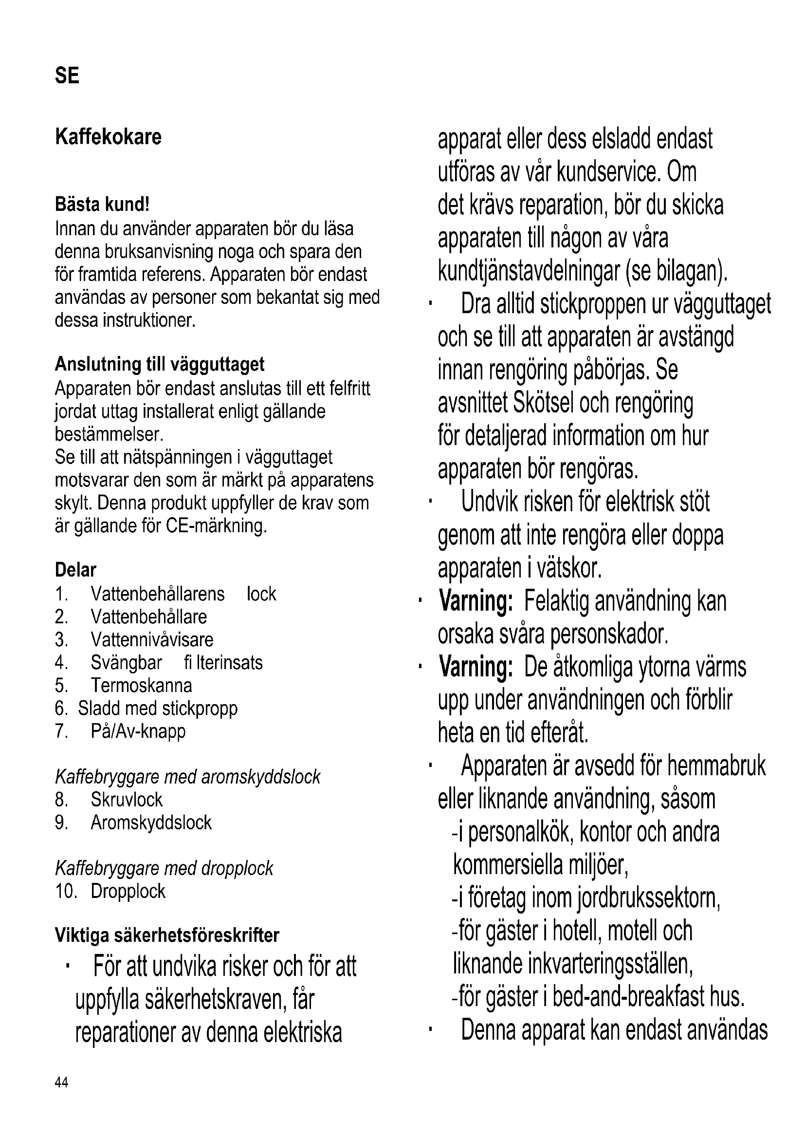 Viktiga säkerhetsföreskrifter ∙ För att undvika risker och för att uppfylla säkerhetskraven, får reparationer av denna elektriska apparat eller dess elsladd endast utföras av vår kundservice. Om det krävs reparation, bör du skicka apparaten till någon av våra kundtjänstavdelningar (se bilagan). ∙ Dra alltid stickproppen ur vägguttaget och se till att apparaten är avstängd innan rengöring påbörjas. Se avsnittet Skötsel och rengöring för detaljerad information om hur apparaten bör rengöras. ∙ Undvik risken för elektrisk stöt genom att inte rengöra eller doppa apparaten i vätskor. ∙ Varning: Felaktig användning kan orsaka svåra personskador. ∙ Varning: De åtkomliga ytorna värms upp under användningen och förblir heta en tid efteråt. ∙ Apparaten är avsedd för hemmabruk eller liknande användning, såsom - i personalkök, kontor och andra kommersiella miljöer, - i företag inom jordbrukssektorn, - för gäster i hotell, motell och liknande inkvarteringsställen, - för gäster i bed-and-breakfast hus. ∙ Denna apparat kan endast användas SE45 av barn (minst 8 år gamla) och av personer som har minskad fysisk rörelseförmåga, reducerat sinnes- eller mentaltillstånd, eller som har bristfällig erfarenhet och kunskap, förutsatt att dessa personer är under uppsyn eller har fått tillräckliga instruktioner beträffande apparatens användning och vet vilka risker och säkerhetsåtgärder som användningen innefattar. ∙ Barn bör inte tillåtas leka med apparaten. ∙ Barn bör inte tillåtas rengöra eller göra service på apparaten ifall de inte är övervakade och minst 8 år gamla. ∙ Apparaten och dess elsladd bör hållas utom räckhåll för barn under 8 år. ∙ Varning: Håll barn på avstånd från apparatens förpackningsmaterial eftersom fara eventuellt kan uppstå. Det fi nns t.ex. risk för kvävning. ∙ Innan varje användning bör apparaten samt dess elsladd och monterade tillbehör inspekteras noga så att de inte har några skador. Om apparaten t ex har tappats på en hård yta, eller om elsladden har utsatts för alltför hård kraft, bör den inte längre användas: Även osynliga skador kan försämra apparatens driftsäkerhet. ∙ Under användningen bör kaffekokaren placeras på en plan och glidfri yta, som tål stänk och fl äckar. ∙ Låt inte apparaten eller elsladden komma i kontakt med heta ytor eller heta källor. ∙ Undvik att hett vatten eller het ånga utlöses genom att alltid stänga av kaffekokaren och låta den svalna tillräckligt lång tid innan du öppnar den eller innan du tar bort några tillbehör. ∙ Se till att barn inte leker med apparaten. ∙ Dra stickproppen ur vägguttaget - om apparaten skulle krångla, - före rengöring, - om apparaten inte använts under en längre tidsperiod. ∙ Tag stickproppen ur vägguttaget genom att dra i stickproppen, aldrig i sladden. ∙ Låt inte elsladden hänga fritt; sladden måste hållas på säkert avstånd från apparatens heta delar. ∙ Inget ansvar godtas om skada uppkommer till följd av felaktig användning, eller om dessa instruktioner inte följts. Automatisk avstängning För att spara energi stänger apparaten automatiskt av sig själv då bryggningen är klar. Innan första användningen Innan kaffekokaren används för första gången bör du låta apparaten göra två eller tre fi ltreringsomgångar med maximal mängd vatten men utan kaffepulver. Detta bör också göras om apparaten inte varit i användning under en längre tid, samt efter avkalkning.46 Allmän information ∙ Måttskalan på vattenbehållaren gör det lättare för dig att fylla behållaren med korrekt mängd rent vatten. Vid dubbel skala är den vänstra skalan avsedd för 125 ml koppar av normal storlek, medan den högra skalan är avsedd för mindre koppar. Se till att den maximala vattenmängden inte överskrids. ∙ Varning: varmvattenröret är inbyggt i vattenbehållarens lock. Försök inte öppna locket medan bryggningen pågår: risk för skållning. ∙ Om fl era bryggningsomgångar krävs efter varandra bör du låta apparaten svalna i ungefär 5 minuter efter varje omgång. ∙ Viktig anmärkning: När du fyller apparaten med färskt vatten strax efter en bryggning slutförts fi nns det en risk för skållning då hett vatten utlöses genom vattenavloppet. Så brygger du kaffe ∙ Fyll med vatten: Öppna vattenbehållarens lock och fyll behållaren med önskad mängd vatten. ∙ Sätt i pappersfi lter: Öppna fi lterinsatsen åt sidan och sätt i ett pappersfi lter av storlek 4, då du först vikit ner den perforerade sidan av fi ltret. ∙ Fyll med malet kaffe: För varje 125 ml kopp krävs cirka 6 g (=1½ - 2 teskedar) fi nt malet kaffe. Stäng locket. ∙ Tillred kaffe i kannan: Sätt aromskyddslocket eller dropplock på kannan och placera kannan i apparaten. Om locket monterats korrekt kommer det att förhindra att “droppstopp”-mekanismen fungerar under bryggningsprocessen. ∙ Starta bryggningsomgången: Sätt stickproppen i ett lämpligt vägguttag och använd på/av-knappen för att koppla på kaffekokaren. Filtreringsomgången startar och vattnet rinner genom fi ltret. ∙ Tag bort kannan: Vänta tills allt vatten har runnit genom fi ltret innan du tar kannan från apparaten. Håll kaffet varmt så länge som möjligt genom att ta bort aromskyddslocket och använda skruvlocket för att stänga kannan. Detta är emellertid inte nödvändigt ifall din kaffekokare har ett dropplock som kan lämnas på kannan. När bryggningsprocessen är klar stänger apparaten automatiskt av sig själv. ∙ Stäng av kaffekokaren: Dra stickproppen ur vägguttaget efter användningen. ∙ Avbryt bryggningsomgången: Du kan avbryta bryggningsprocessen genom att trycka på på/av-knappen igen. Kaffebryggare med dropplock Under fi ltreringsprocessen och när kaffet skall serveras behöver du inte ta bort dropplocket, utan det får lämnas kvar på kannan. Då du s
