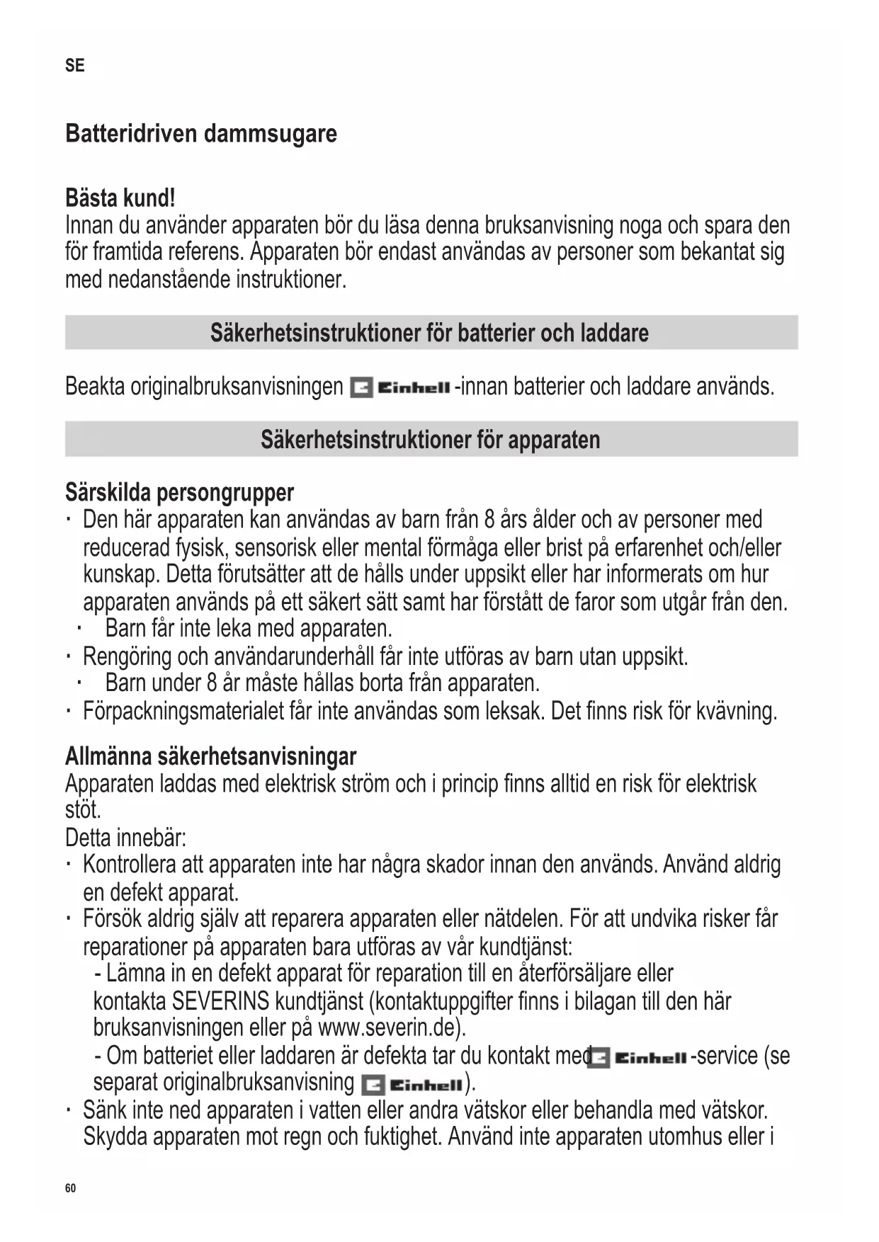 ∙ Sänk inte ned apparaten i vatten eller andra vätskor eller behandla med vätskor. Skydda apparaten mot regn och fuktighet. Använd inte apparaten utomhus eller i SE61 142 x 208 mm utrymmen med hög luftfuktighet. ∙ Ta inte i apparaten med blöta händer. ∙ Stäng av apparaten innan rengöring, underhåll eller byte av tillbehör. Roterande borstvals Apparaten har en motordriven borstvals i golv- och möbelmunstycket. Den kan förorsaka personskador. Beakta därför följande: ∙ Säkerställ inför rengöring eller underhåll av apparaten att apparaten är avstängd och att den inte laddas. ∙ Se till att det aldrig kan komma in en kroppsdel under borstvalsen. ∙ Sug inte i närheten av kablar, ledningar och långa fransar. För det första nns det risk för att kabelisoleringen skadas. För det andra kan föremålen fastna i borstvalsen och därmed skada apparaten. ∙ Om något av misstag sugs in som blockerar borstvalsen, stängs enheten av automatiskt av säkerhetsskäl. LED-belysning På golvmunstycket nns det inbyggda LED-lampor som lyser upp arbetsområdet framför golvmunstycket. ∙ Titta inte rakt in i LED-lamporna under användning. ∙ Det går inte att byta ut LED-lamporna. Avsedd användning ∙ Apparaten får användas endast i hushållet. ∙ Apparaten får endast användas för rengöring av plana, normalt nedsmutsade ytor, korthåriga mattor, klädsel eller andra ytor som anges i denna bruksanvisning och som utan skador tål belastningen från borstvalsen. ∙ All annan användning räknas som felaktig användning. För att förebygga personskador, bränder och sakskador får apparaten inte användas för dammsugning av: ∙ Människor, djur eller växter. Håll alltid apparaten borta från kroppsdelar, hår och kläder (t.ex. skosnören). Sug inte i närheten av huvudet. ∙ Glödande, brinnande eller glimmande partiklar (såsom aska, kol, träkol, cigaretter, tändstickor). ∙ Explosiva eller lättantändliga ämnen eller toner. ∙ Vatten och andra vätskor, exempelvis fuktiga mattrengöringsmedel. ∙ Vassa föremål såsom glassplitter, spikar eller byggavfall. ∙ Fint damm som gips, cement, byggdamm, puder62 142 x 208 mm Dessutom är följande förbjudet: ∙ Ombyggnad eller reparation av apparaten i egen regi. ∙ Att sticka in föremål i apparatens öppningar. Det tillhörande tillbehöret undantas. ∙ Att använda, förvara eller ladda batteriet i apparaten utomhus. CE-märkning Apparaten motsvarar EU-direktiven, som krävs för CE-märkningen. Apparatuppbyggnad och leveransens omfattning Apparaten monterad