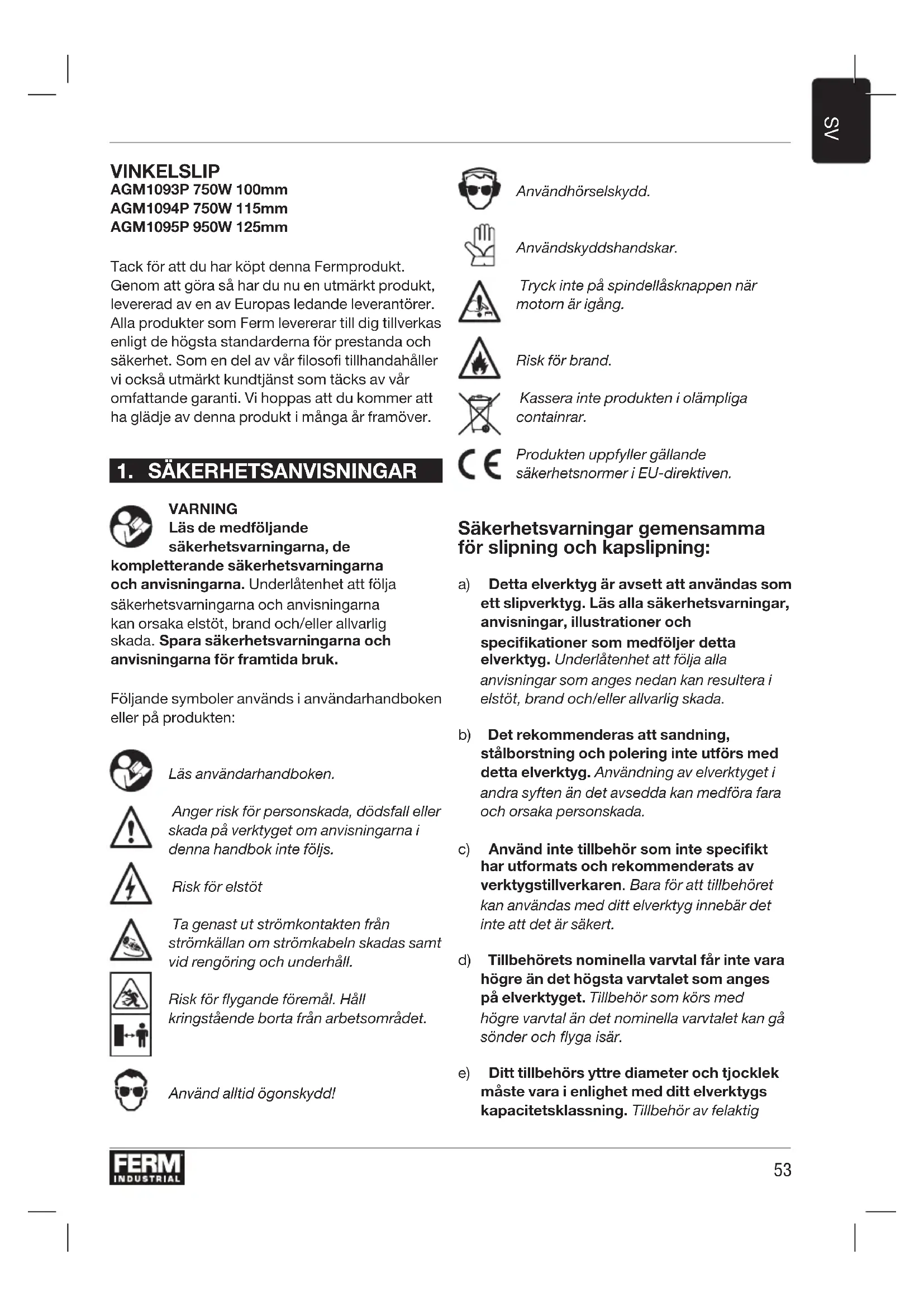 VINKELSLIP AGM1093P 750W 100mm AGM1094P 750W 115mm AGM1095P 950W 125mm Tack för att du har köpt denna Fermprodukt. Genom att göra så har du nu en utmärkt produkt, levererad av en av Europas ledande leverantörer. Alla produkter som Ferm levererar till dig tillverkas enligt de högsta standarderna för prestanda och säkerhet. Som en del av vår filosofi tillhandahåller vi också utmärkt kundtjänst som täcks av vår omfattande garanti. Vi hoppas att du kommer att ha glädje av denna produkt i många år framöver.