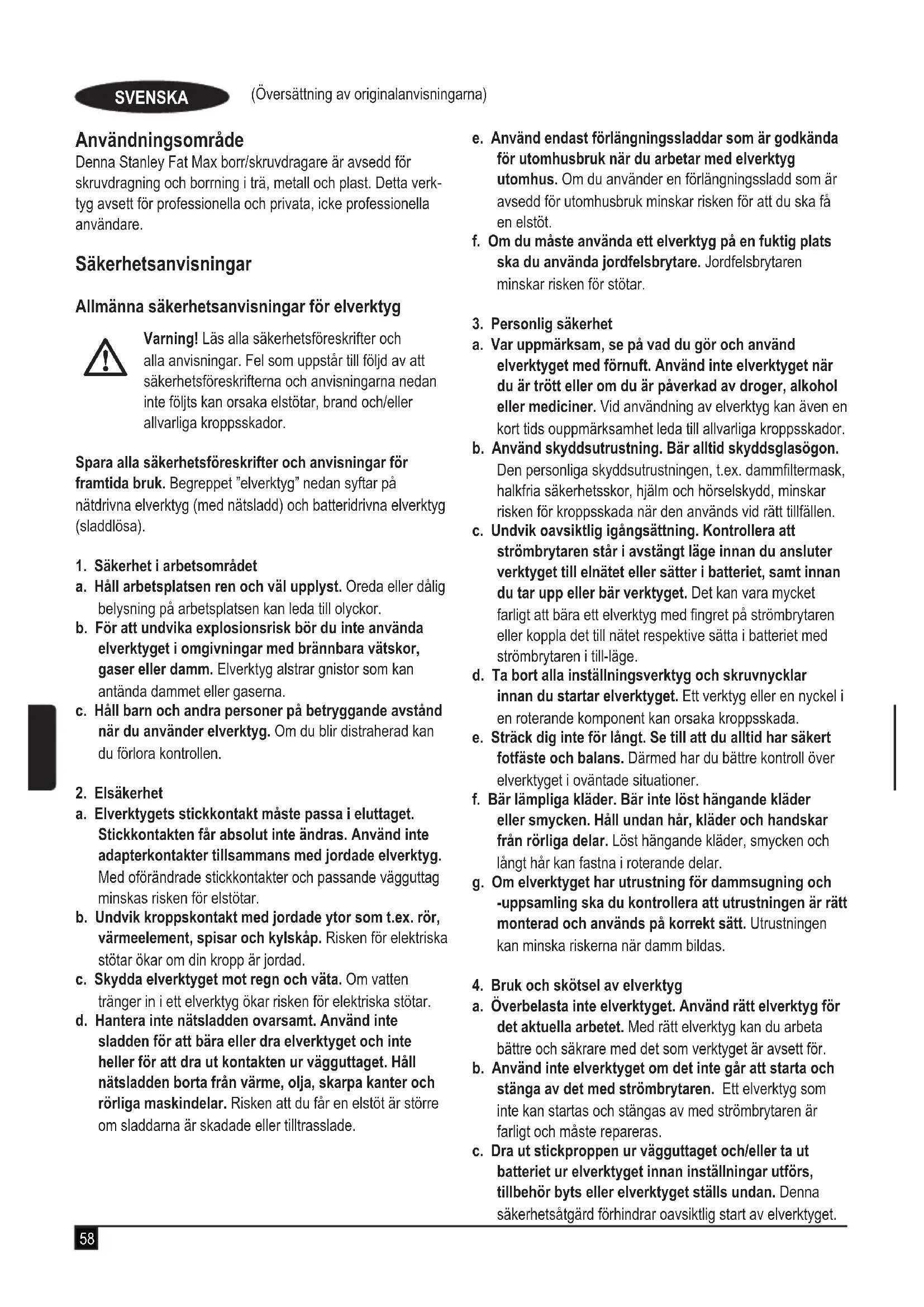 Om din Stanley Fat Max-produkt går sönder på grund av material- och/eller fabrikationsfel inom 12 månader från köpet, åtar sig Stanley Europe att byta ut alla trasiga delar utan kost- nad med minsta besvär för kunden eller, efter eget godtycke, utan kostnad byta ut produkten förutsatt att: u produkten inte har misskötts och har använts enligt bruksanvisningen. u produkten har utsatts för normalt slitage. u reparationer inte har utförts av personer som inte är auktoriserade reparatörer. u inköpskvitto nns. u Stanley Fat Max-produkten returneras komplett med alla originaldelar Om du vill göra ett garantianspråk kontaktar du åter- försäljaren, letar upp närmaste auktoriserade Stanley Fat Max-verkstad i Stanley Fat Max-katalogen eller kontaktar det lokala Stanley-kontoret på den adress som är angiven i bruksanvisningen. En lista över alla auktoriserade Stanley Fat Max-verkstäder samt servicevillkor nns på Internet:www. stanley.eu/365 (Oversettelse av de opprinnelige instruksjonene) NORSK Bruksområde Din Stanley Fat Max drill/skrutrekker er utformet for bruk som skrutrekker og for boring i tre, metall og plast. Dette verktøyet ment for profesjonelle og private, ikke-profesjonelle brukere. Sikkerhetsinstruksjoner Generelle sikkerhetsadvarsler for elektroverktøy