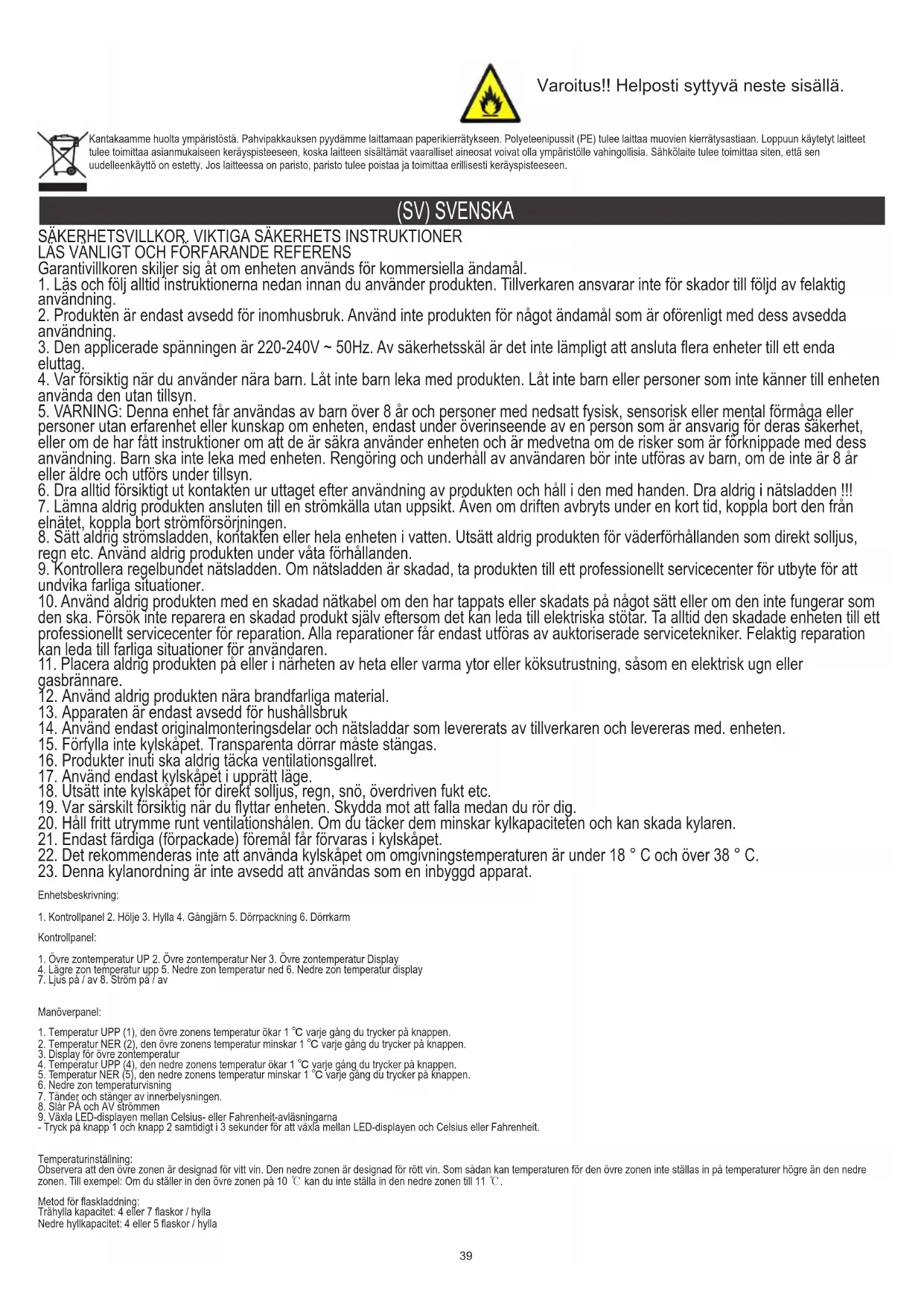 G) Indikatorlampa: När temperaturen i skåpet ligger utanför det inställda temperaturområdet, lyser både upp och ner-indikatorlampan. När temperaturen når inställningstemperaturen släcks lampan automatiskt. Tekniska detaljer: Ingångsspänning: 220-240V ~ 50Hz Ström: 0.4A Kapacitet: 60L / 24 flaskor Kylmedel: R600a / 23g Klimatklass: ST Vi sköter om miljön. Överlämna förpackningar i kartong till pappersavfall. Polyetylensäckar (PE) slängs i avfallsbehållare för plast. Man bör lämna en gammal apparat till en riktig återvinningscentral, eftersom farliga komponenter i apparaten kan orsaka fara till miljön. En elektrisk apparat bör lämnas för att minska förnyad användning av denna. Om apparaten innehåller batterier, bör man ta bort dem och lämna dem separat till återvinningscentraler. (SK) SLOVENSKÝ BEZPEČNOSTNÉ PODMIENKY. DÔLEŽITÉ BEZPEČNOSTNÉ POKYNY PREČÍTAJTE SI PROSÍM POZORNE A UCHOVÁVAJTE PRE BUDÚCU REFERENCIU Záručné podmienky sa líšia, ak sa zariadenie používa na komerčné účely. 1. Pred použitím produktu si prečítajte a vždy postupujte podľa pokynov uvedených nižšie. Výrobca neručí za škody vzniknuté nesprávnym používaním.