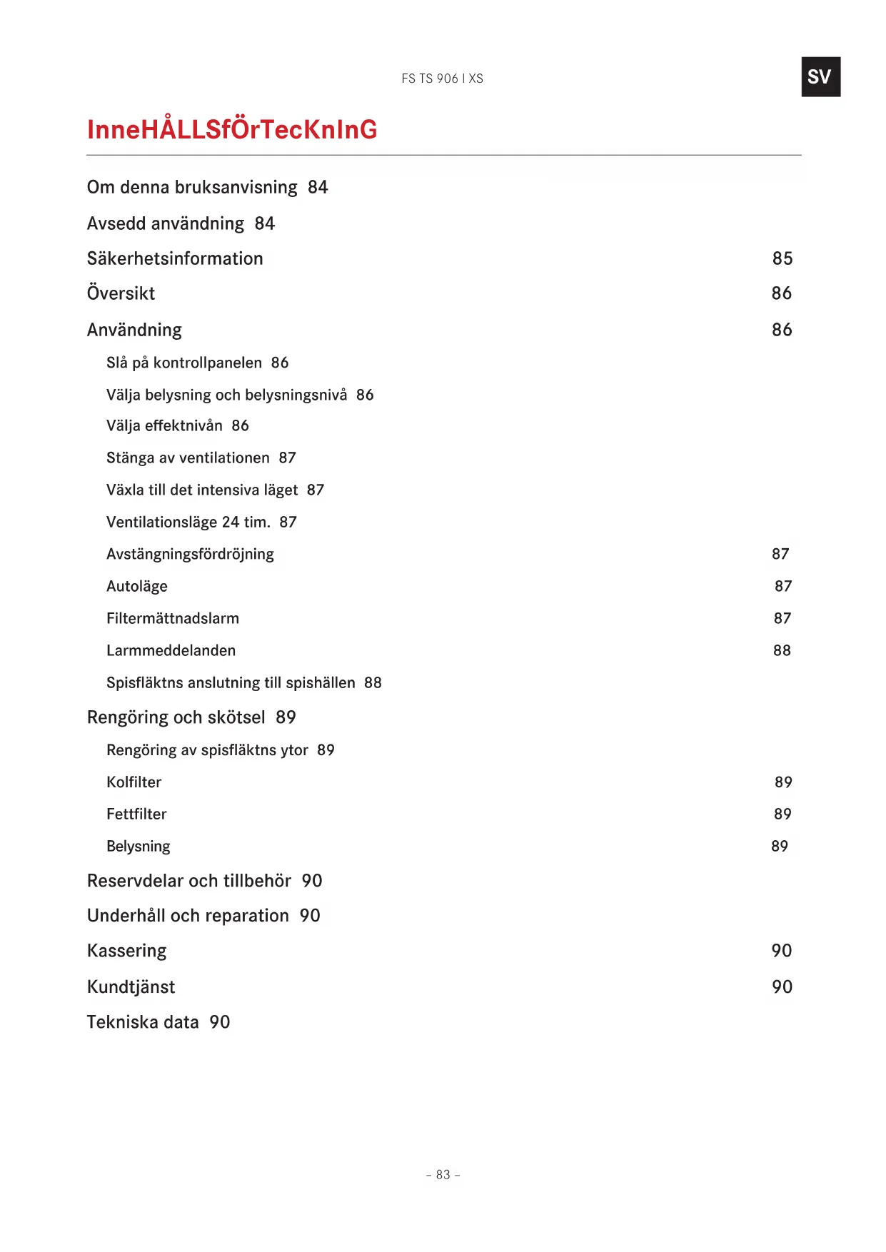 innehållsförTecKning Om denna bruksanvisning 84 Avsedd användning 84 Säkerhetsinformation 85 Översikt 86 Användning 86 Slå på kontrollpanelen 86 Välja belysning och belysningsnivå 86 Välja effektnivån 86 Stänga av ventilationen 87 Växla till det intensiva läget 87 Ventilationsläge 24 tim. 87 Avstängningsfördröjning 87 Autoläge 87 Filtermättnadslarm 87 Larmmeddelanden 88 Spisfläktns anslutning till spishällen 88 Rengöring och skötsel 89 Rengöring av spisfläktns ytor 89 Kolfilter 89 Fettfilter 89 Belysning 89 Reservdelar och tillbehör 90 Underhåll och reparation 90 Kassering 90 Kundtjänst 90 Tekniska data 90FS TS 906 I XS – 84 –