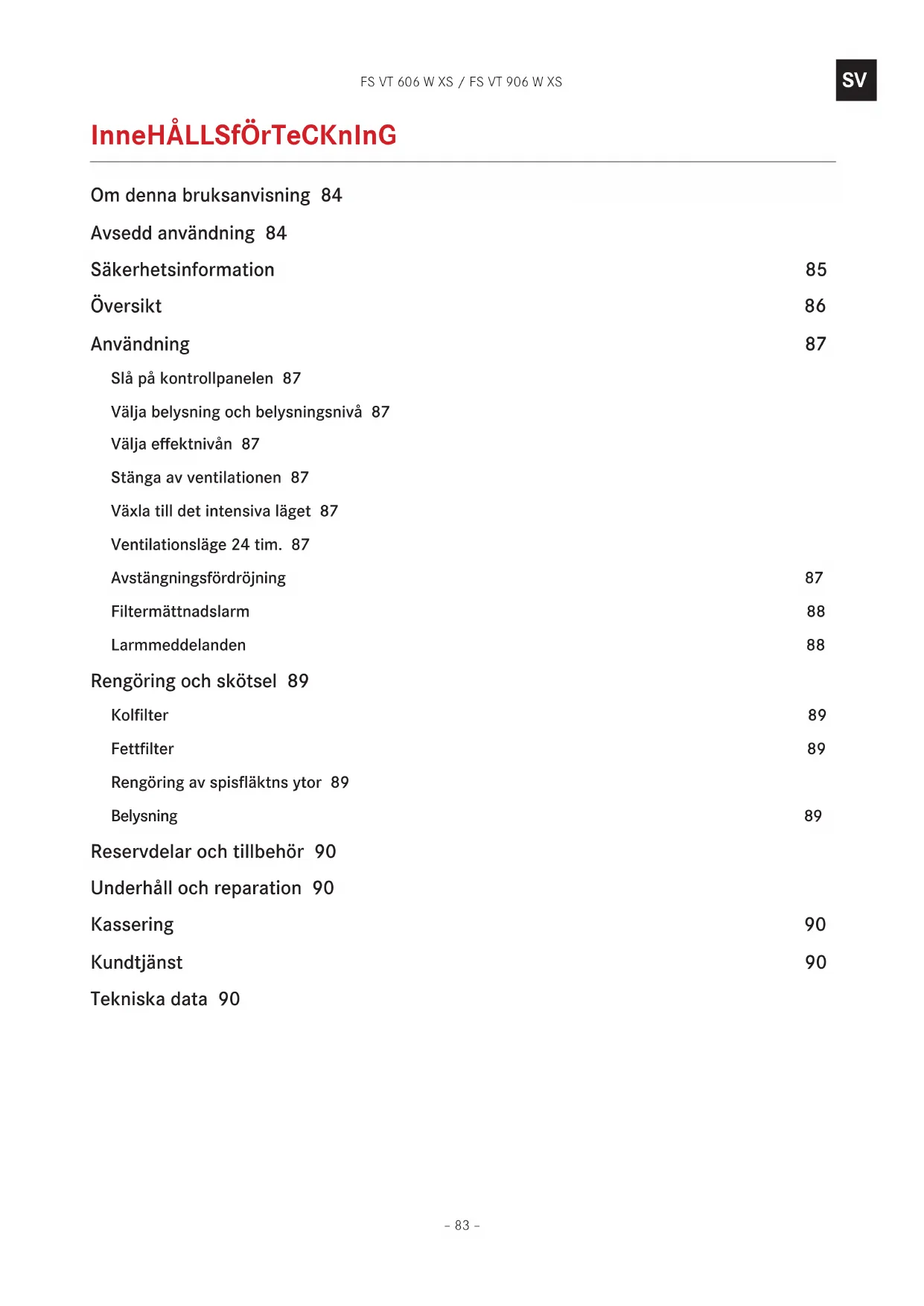 innehållsförTeCKning Om denna bruksanvisning 84 Avsedd användning 84 Säkerhetsinformation 85 Översikt 86 Användning 87 Slå på kontrollpanelen 87 Välja belysning och belysningsnivå 87 Välja effektnivån 87 Stänga av ventilationen 87 Växla till det intensiva läget 87 Ventilationsläge 24 tim. 87 Avstängningsfördröjning 87 Filtermättnadslarm 88 Larmmeddelanden 88 Rengöring och skötsel 89 Kolfilter 89 Fettfilter 89 Rengöring av spisfläktns ytor 89 Belysning 89 Reservdelar och tillbehör 90 Underhåll och reparation 90 Kassering 90 Kundtjänst 90 Tekniska data 90FS VT 606 W XS / FS VT 906 W XS – 84 –