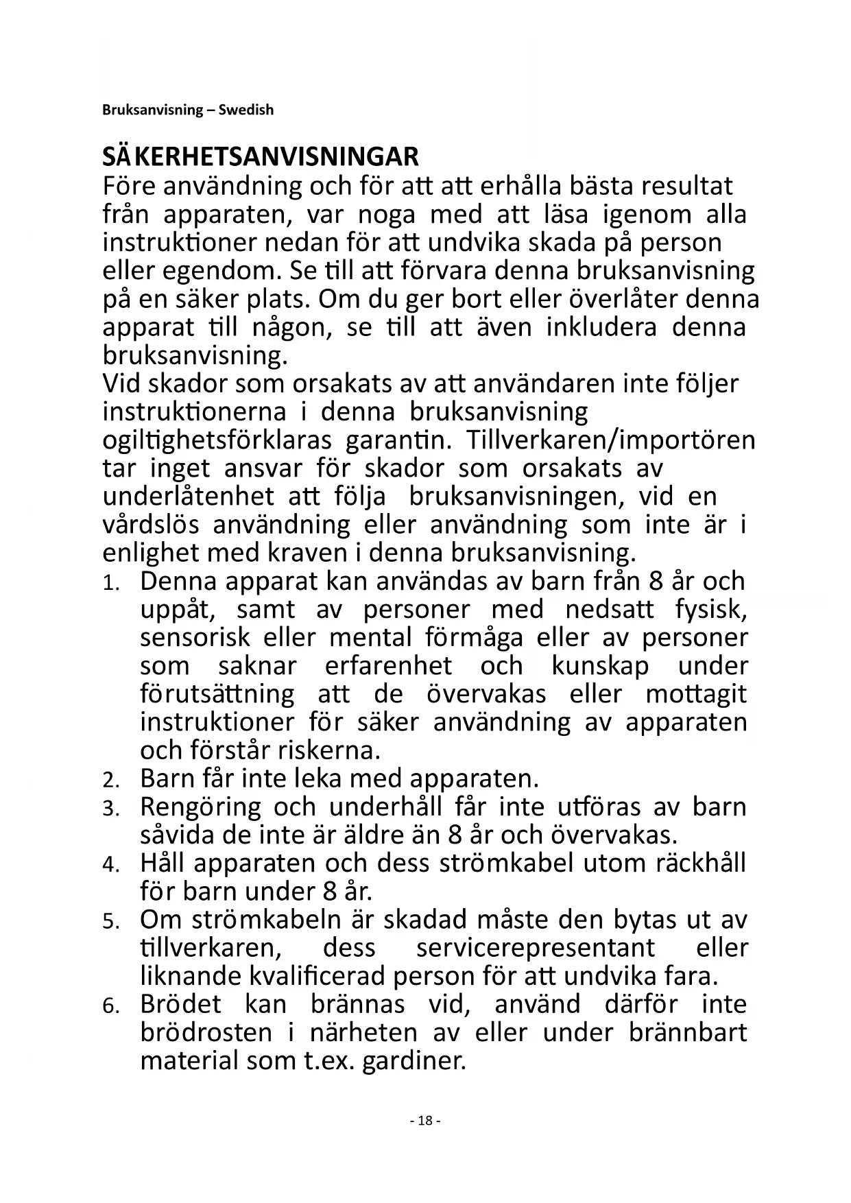 har samlats ramlar ut. Rengör smulfacket regelbundet så att det inte samlas smulor i brödrosten. TEKNISKA DATA Driftsspänning: 220-240V ~ 50-60Hz Effekt: 700W- 22 -