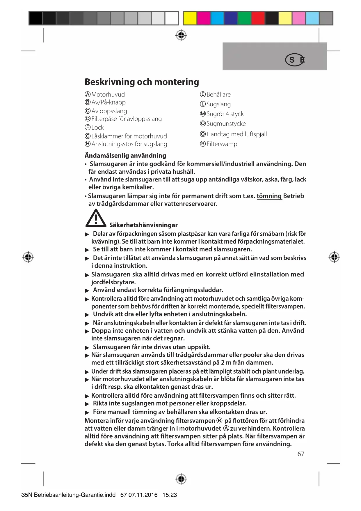 - Slamsugaren lampar sig inte for permanent drift som t.ex.ömning Betrieb av tradgårdsdammar eller vattenreservoirer.