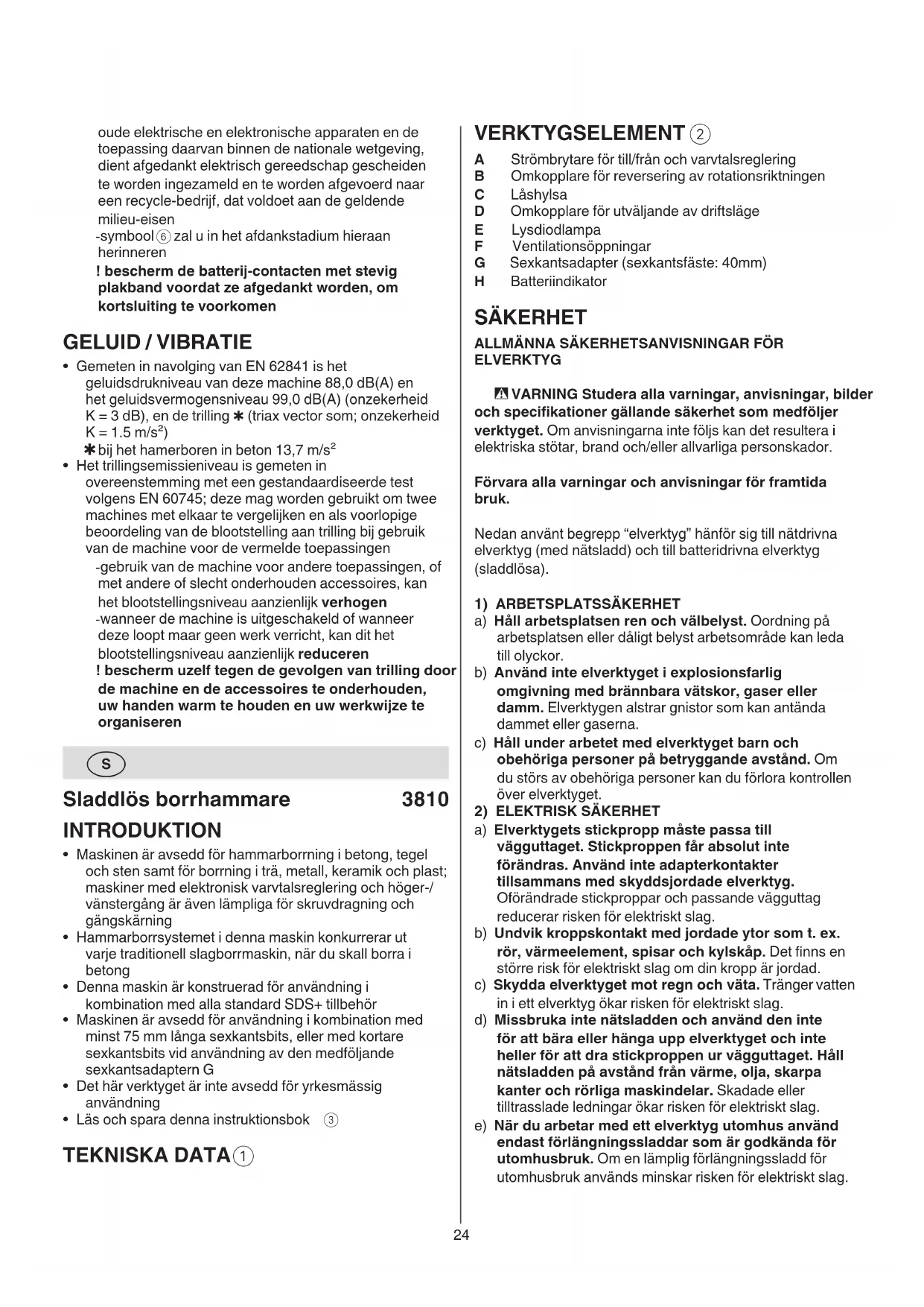 ELVERKTYG - VARNING Studera alla varningar, anvisningar, bilder och specikationer gällande säkerhet som medföljer verktyget. Om anvisningarna inte följs kan det resultera i elektriska stötar, brand och/eller allvarliga personskador. Förvara alla varningar och anvisningar för framtida bruk. Nedan använt begrepp “elverktyg” hänför sig till nätdrivna elverktyg (med nätsladd) och till batteridrivna elverktyg (sladdlösa).