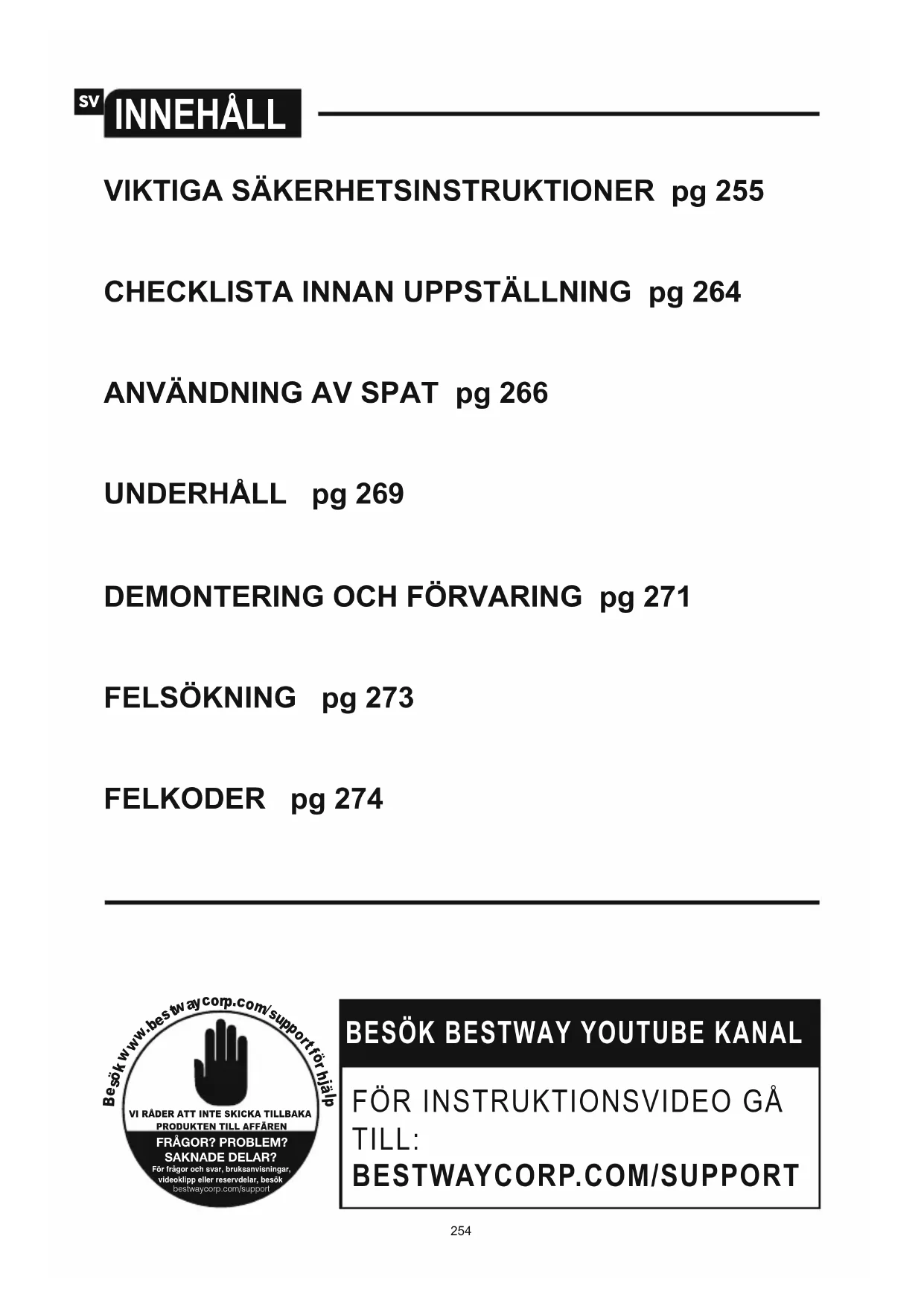 - Skydda spabadet från direkt solljus med spaskyddet när det inte används. PRCD-VARNING VARNING: Innan kontakten sätts i eluttaget, se till att strömstyrkan överensstämmer med den som är angiven på pumpen. VARNING: Om du använder en förlängningssladd eller ett grenuttag med spavärmaren kan kontakten bli överhettad. Detta kan leda till att utrustningen och omgivande föremål skadas. Spat är en elektrisk apparat (klass 1) och måste direktanslutas till ett jordat uttag. Vi rekommenderar att använda ett uttag som är vatten- och fuktresistent och kapabelt för högbelastning. Kontrollera regelbundet kontakten och uttaget för tecken på skador innan du använder spat. Använd inte spat om kontakten eller uttaget är skadat. Om du inte är säker på elförsörjningens kvalitet, kontakta en kvalificerad elektriker innan användning. VARNING: Jordfelsbrytar-kontakten måste testas innan varje användning för att undvika risken för elektriska stötar. VARNING: Använd inte pumpen om testet misslyckas. För assistans, besök hjälpavdelningen på vår webbplats, www.bestwaycorp.com. 256SÄKERHETSANVISNINGAR Läs noggrant och se till att du förstår all information i bruksanvisningen innan du installerar och använder spabadet. VIKTIGA SÄKERHETSANVISNINGAR - LÄS OCH FÖLJ ALLA ANVISNINGAR. VARNING!