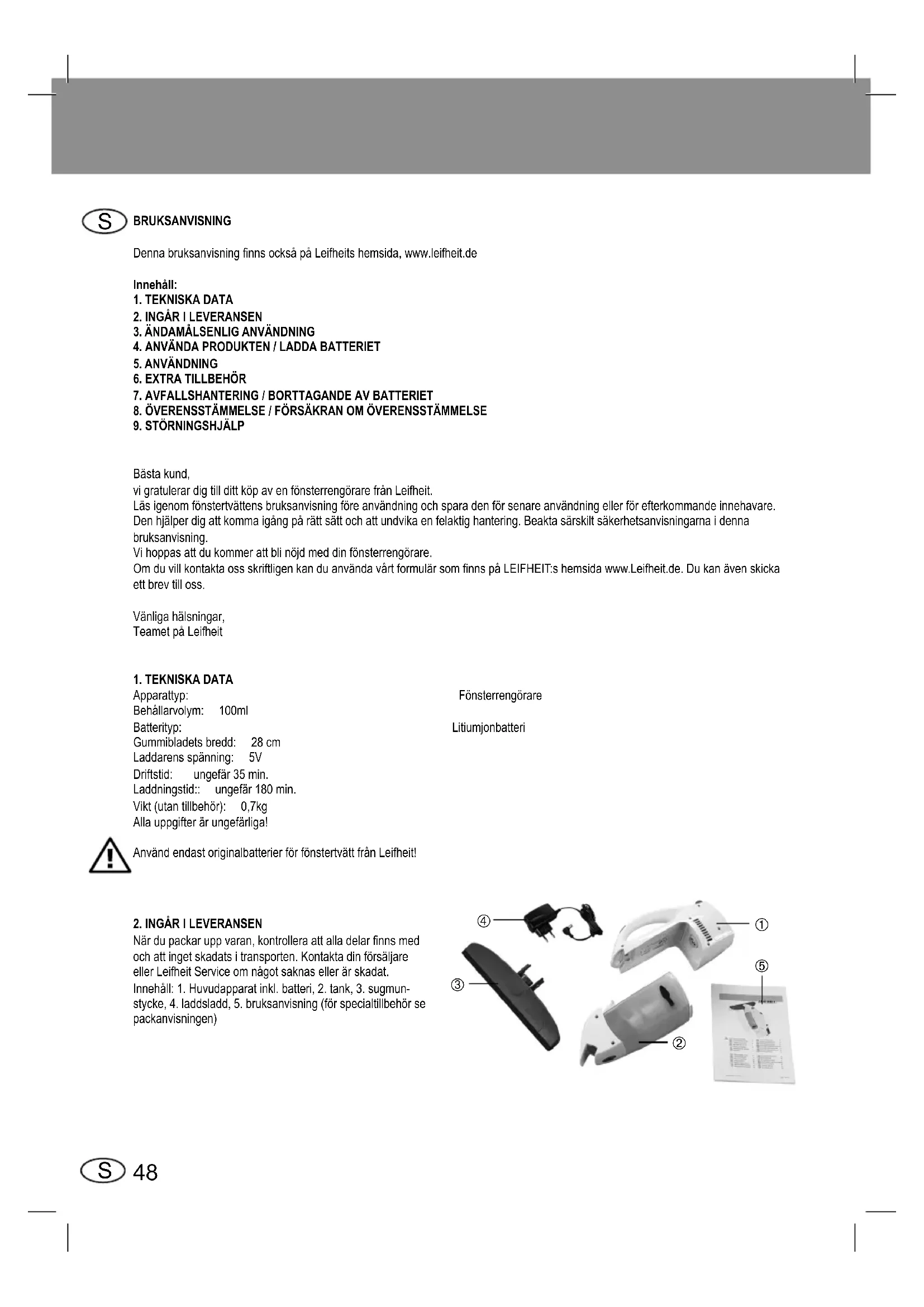 Närdupackaruppvaran,kontrolleraattalladelarnnsmed och att inget skadats i transporten. Kontakta din försäljare eller Leifheit Service om något saknas eller är skadat. Innehåll: 1. Huvudapparat inkl. batteri, 2. tank, 3. sugmun- stycke, 4. laddsladd, 5. bruksanvisning (för specialtillbehör se packanvisningen)