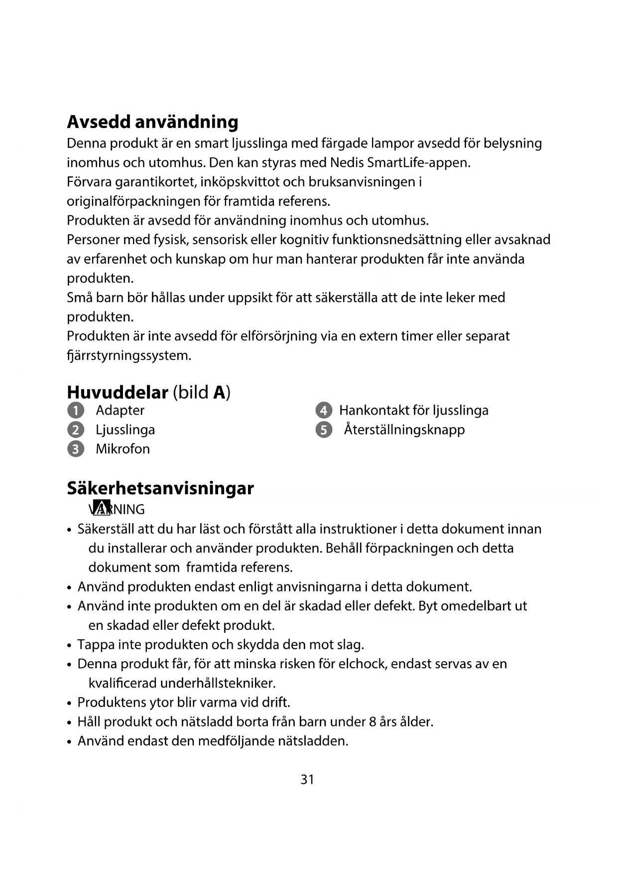 Snabbstartsguide Smart ljusslinga med färgade lampor och wi WIFILX01C42 | WIFILX01C84 | WIFILX01C168För ytterligare information, se den utökade manualen online: ned.is/wilx01c42 | ned.is/wilx01c84 | ned.is/wilx01c16831 Avsedd användning Denna produkt är en smart ljusslinga med färgade lampor avsedd för belysning inomhus och utomhus. Den kan styras med Nedis SmartLife-appen. Förvara garantikortet, inköpskvittot och bruksanvisningen i originalförpackningen för framtida referens. Produkten är avsedd för användning inomhus och utomhus. Personer med fysisk, sensorisk eller kognitiv funktionsnedsättning eller avsaknad av erfarenhet och kunskap om hur man hanterar produkten får inte använda produkten. Små barn bör hållas under uppsikt för att säkerställa att de inte leker med produkten. Produkten är inte avsedd för elförsörjning via en extern timer eller separat ärrstyrningssystem. Huvuddelar (bild A) 1 Adapter 2 Ljusslinga 3 Mikrofon 4 Hankontakt för ljusslinga 5 Återställningsknapp Säkerhetsanvisningar