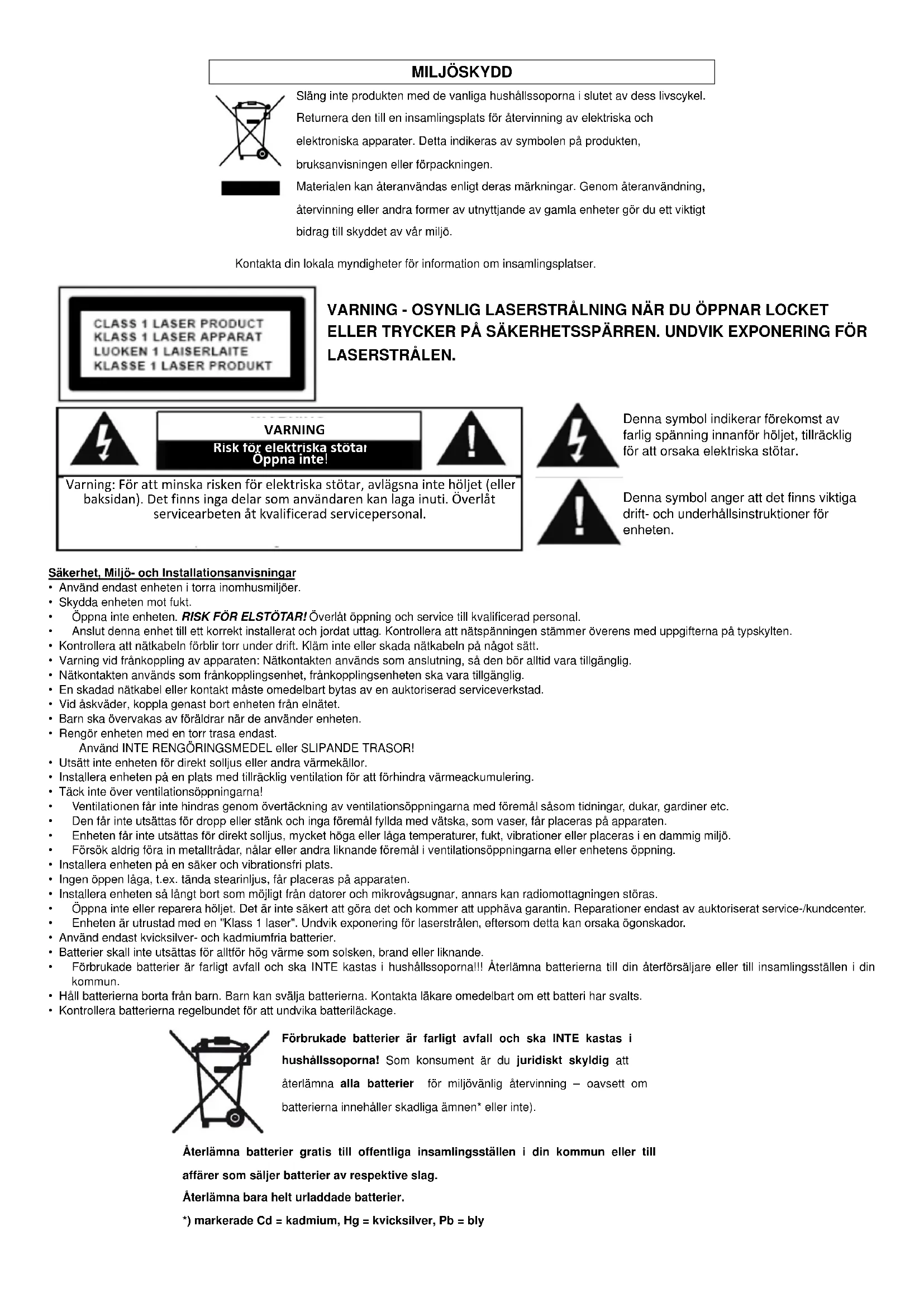 - Enheten är utrustad med en "Klass 1 laser". Undvik exponering för laserstrålen, eftersom detta kan orsaka ögonskador.