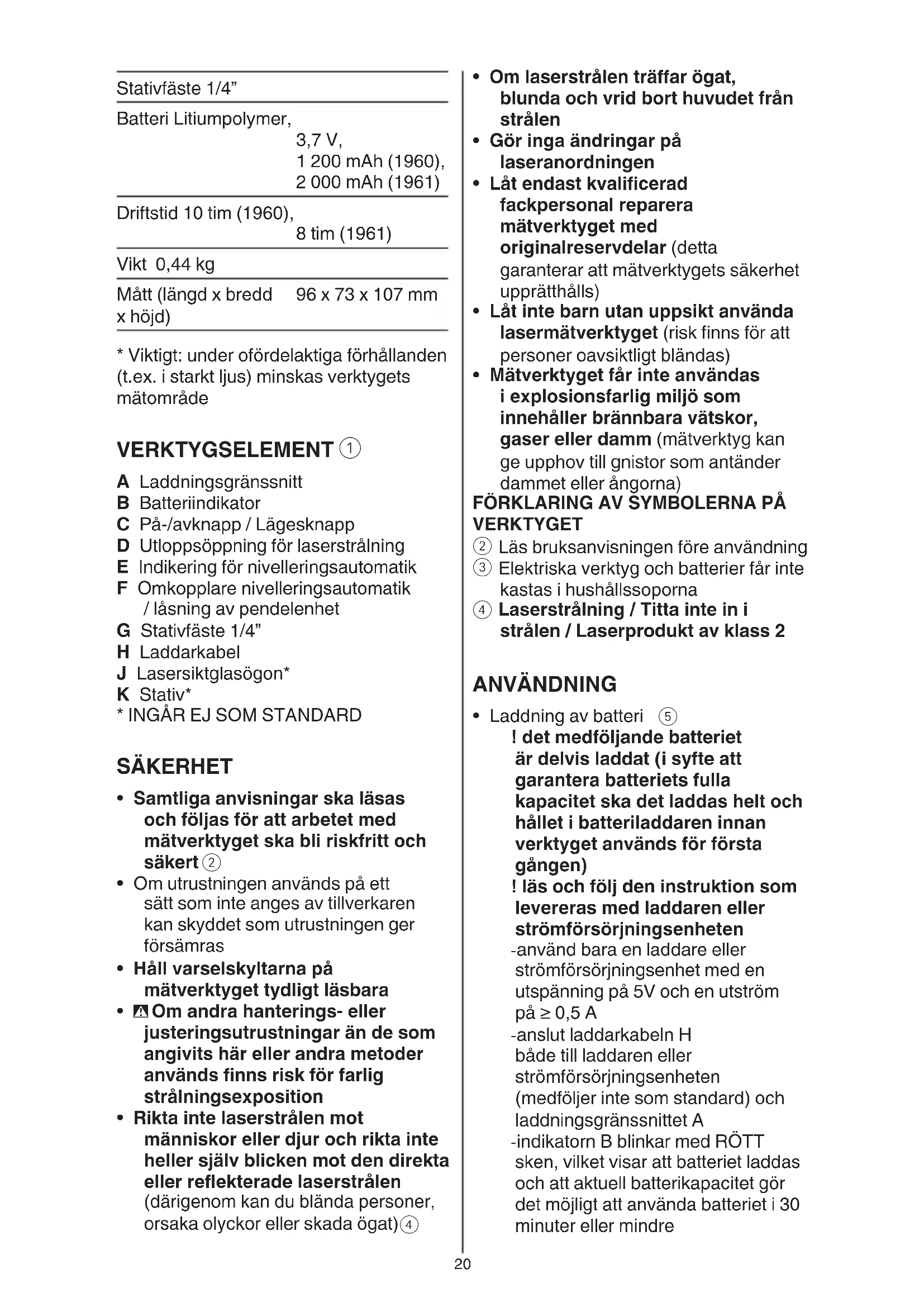 ! det medföljande batteriet är delvis laddat (i syfte att garantera batteriets fulla kapacitet ska det laddas helt och hållet i batteriladdaren innan verktyget används för första gången) ! läs och följ den instruktion som levereras med laddaren eller strömförsörjningsenheten - använd bara en laddare eller strömförsörjningsenhet med en utspänning på 5V och en utström på ≥ 0,5 A - anslut laddarkabeln H både till laddaren eller strömförsörjningsenheten (medföljer inte som standard) och laddningsgränssnittet A - indikatorn B blinkar med RÖTT sken, vilket visar att batteriet laddas och att aktuell batterikapacitet gör det möjligt att använda batteriet i 30 minuter eller mindre Stativfäste 1/4” Batteri Litiumpolymer, 3,7 V, 1 200 mAh (1960), 2 000 mAh (1961) Driftstid 10 tim (1960), 8 tim (1961) Vikt 0,44 kg Mått (längd x bredd x höjd) 96 x 73 x 107 mm