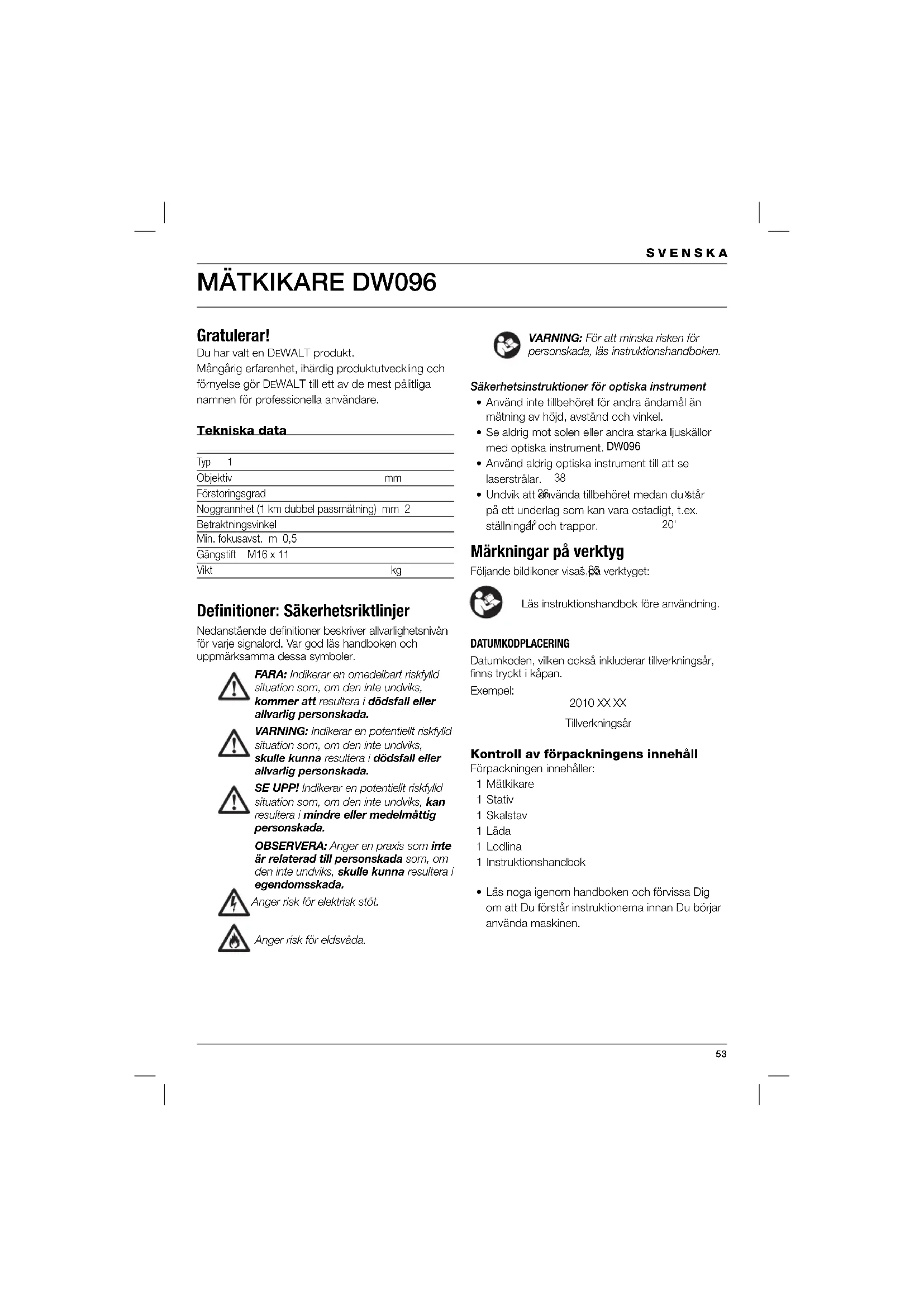 Gratulerar! Du har valt en DEWALT produkt. Mångårig erfarenhet, ihärdig produktutveckling och förnyelse gör D EWALT till ett av de mest pålitliga namnen för professionella användare. Tekniska data DW096 Typ 1 Objektiv mm 38 Förstoringsgrad 26 x Noggrannhet (1 km dubbel passmätning) mm 2 Betraktningsvinkel 1° 20' Min. fokusavst. m 0,5 Gängstift M16 x 11 Vikt kg 1,85 Defi nitioner: Säkerhetsriktlinjer Nedanstående definitioner beskriver allvarlighetsnivån för varje signalord. Var god läs handboken och uppmärksamma dessa symboler. FARA: Indikerar en omedelbart riskfylld situation som, om den inte undviks, kommer att resultera i dödsfall eller allvarlig personskada. VARNING: Indikerar en potentiellt riskfylld situation som, om den inte undviks, skulle kunna resultera i dödsfall eller allvarlig personskada. SE UPP! Indikerar en potentiellt riskfylld situation som, om den inte undviks, kan resultera i mindre eller medelmåttig personskada. OBSERVERA: Anger en praxis som inte är relaterad till personskada som, om den inte undviks, skulle kunna resultera i egendomsskada. Anger risk för elektrisk stöt. Anger risk för eldsvåda. VARNING: För att minska risken för personskada, läs instruktionshandboken. Säkerhetsinstruktioner för optiska instrument